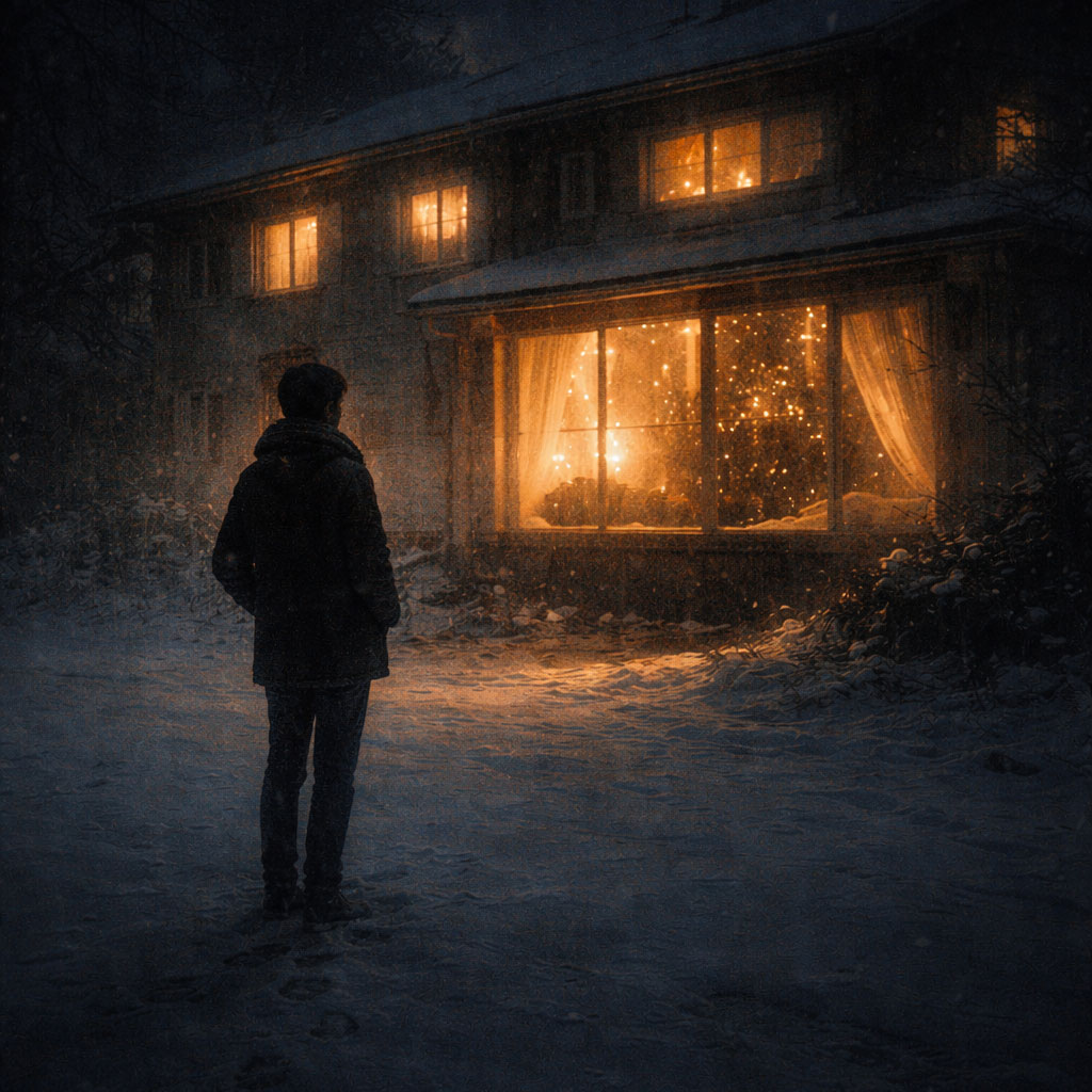 lofi, christmas glitch, reverse bells, distant indoor warmth heard through walls, muffled celebration ambience, cold outdoor night air, slow footsteps texture, low sustained pads, sparse piano fragments, minimal pulse, wide empty space, restrained melancholy, sense of watching but not entering, quiet resolve, instrumental