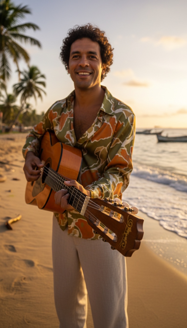 Reggae acústico com arranjos de ukulele acústico e flauta doce, com acompanhamento acústico de cajon bongô e um leve chocalho