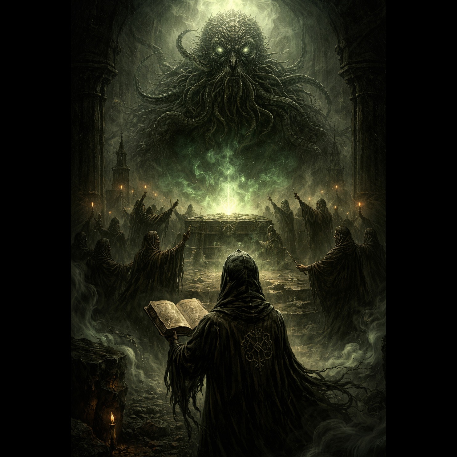 Hauntology horror-ambient with ritual chant hooks; slow 72 BPM feel; detuned upright piano, bowed cymbals, sub-bass drones, musique-concrète textures, radio-voice ghosts; dissonant choir pads; whispered spoken-word verses, layered call-and-response chorus chants; sudden dropouts and abrupt stops; claustrophobic reverb like stone tunnels; unsettling, cinematic, Lovecraftian dread