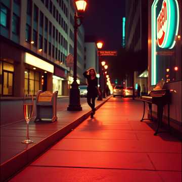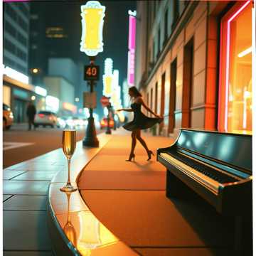 Upbeat romantic pop-swing instrumental with a light, city-chic energy, Key: C major, Tempo: 108 BPM, gentle swing feel, Lead is bright, sparkling piano with playful rhythmic comping, accented by crisp acoustic guitar strums, Light horn stabs (trumpet and muted trombone) punctuate choruses and pre-chorus hits, adding charm and subtle elegance, Soft upright bass drives the groove with a warm, bouncy foundation, while a tight, brushed drum kit provides a swinging yet relaxed pocket, Optional glockenspiel or chime accents add holiday-like twinkle in melodic fills, Arrangement is concise, polished, and radio-friendly (~3 min), evoking playful nighttime city romance, laughter in the streets, and carefree, intimate moments, Perfect for a female crooner lead, sing-along choruses, and charming pop-swing storytelling