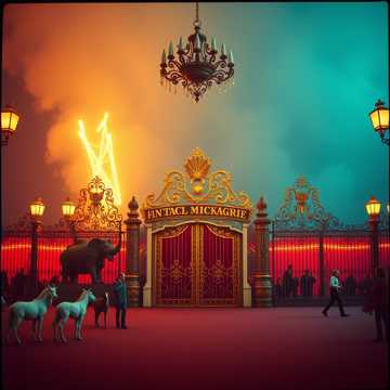 Theatrical anthem rock with dynamic piano, electric guitar flourishes, and rich vocal harmonies, British male vocals with refined Southern English accent, clear diction, and dramatic range from midrange to soaring falsetto, Song builds from mysterious verse to explosive chorus with stacked harmonies and orchestral hits, Tempo shifts from ceremonial march to triumphant gallop, Features piano-driven verses, guitar solos, handclaps, and choir sections, Sound is bold, regal, and arena-sized with both grandeur and danger—perfect for a magical menagerie entrance, ‑Country, ‑trap, ‑bedroom pop, ‑lo-fi, ‑punk, ‑death metal, ‑mumble rap