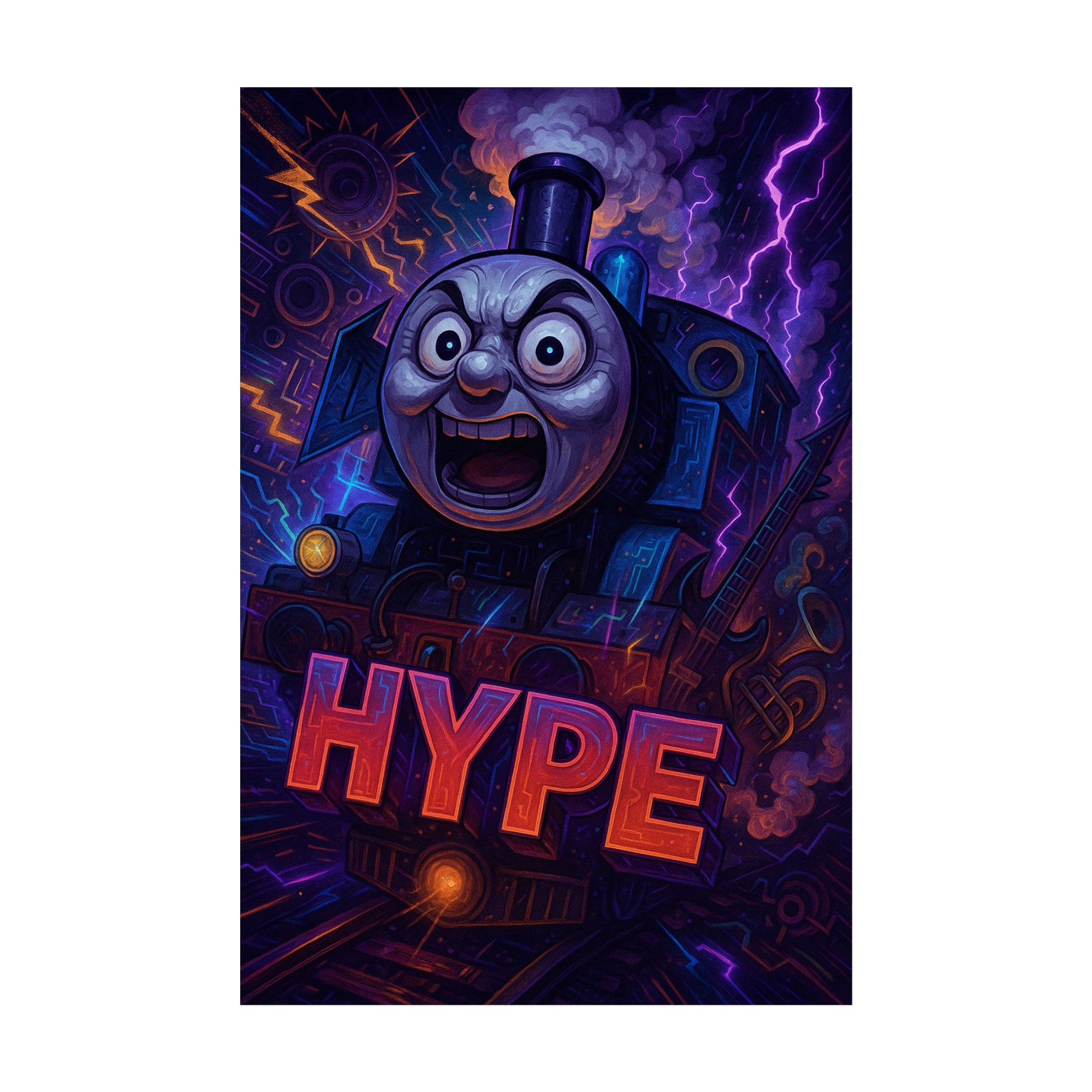 An electrifying fusion: metallic techno rhythms with steam-powered industrial percussion, chest-rattling trap sub-bass, and fragmented vocal stabs, Multiverse drum'n'bass breakbeats collide with sparkling synthwave arpeggios, Mechanized punk guitars slash through cartoonish brass and pipe organ, while quirky, staccato melodies and eccentric sound design provide an eerie, animated Tim Burton edge, Relentless build-ups, sudden drops, and whirlwind tempo shifts channel a manic hype, mirroring a runaway train entering new sonic dimensions