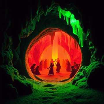 Psychedelic trance EDM, witch house, dark ambience, 145 BPM, rolling basslines, hypnotic acid leads, tribal percussion, trippy builds with sweeping filters, intense driving drops, dark mystical atmosphere, raspy goblin-like male vocals with heavy reverb and delays, underground cave echoes and splashing water sounds