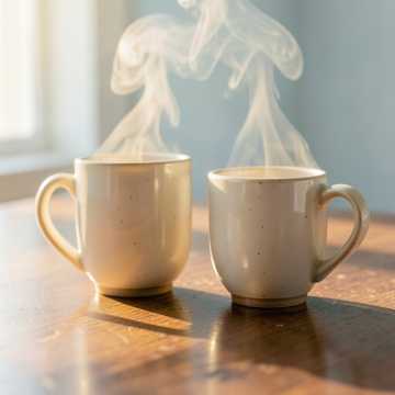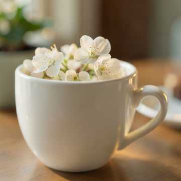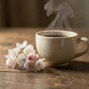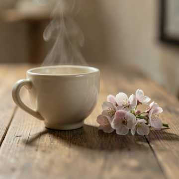 Instruments: warm acoustic piano (main), soft upright bass (minimal), brushed jazz drums (very light), gentle ambient pad, subtle strings texture, Structure: start immediately with soft piano motif, relaxed flow: Theme A → gentle variation → Theme B (warmer tone) → development with sustained chords → piano improvisation break → return theme → soft fading outro, extend sections for ~4 minutes, Performance: softer touch, more sustain, slower phrasing feel, avoid rhythmic busyness, focus on warmth and smooth flow, expressive but calm, Mood: warm tea on a quiet table, small blossoms beside, calm and cozy, slightly dreamy, peaceful and comforting, perfect for relaxed café or slow afternoon listening