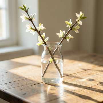 Instruments: warm acoustic piano (main), upright bass (light groove), brushed jazz drums (soft swing feel), gentle ambient pad, subtle strings texture, Structure: start immediately with bright piano motif, smooth flow: Theme A → rhythmic variation → Theme B (more open melody) → development with gentle groove → piano improvisation break → return theme → soft outro, extend sections for ~4 minutes, Performance: slightly more rhythmic clarity, light bounce, clean articulation, expressive but relaxed, smooth transitions, no dense playing, Mood: sunlight through window, flowers in a vase, warm and airy, calm but gently uplifting, cozy café spring vibe, peaceful and refreshing