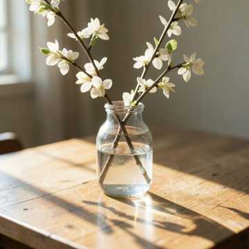 Instruments: warm acoustic piano (main), soft upright bass, brushed jazz drums, gentle ambient pad, very light strings texture, Structure: start immediately with simple piano motif, calm progression: Theme A → spacious variation → Theme B → development with richer chords → piano improvisation break → minimal return → soft outro, keep sections extended for ~4 minutes, Performance: more space between notes, slightly slower phrasing feel, deeper sustain, expressive touch, avoid busy playing, focus on emotional clarity and flow, Mood: quiet spring afternoon at a table, soft light, still air, peaceful and reflective but warm, cozy and immersive, gentle and calming without being sleepy