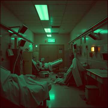 Hard industrial breakbeat with distorted basslines, glitchy effects, emergency sirens, robotic hospital announcements, and punk-style shouted vocals, Inspired by The Prodigy, High energy, chaotic, dirty rave sound with breakdowns and siren-like synths