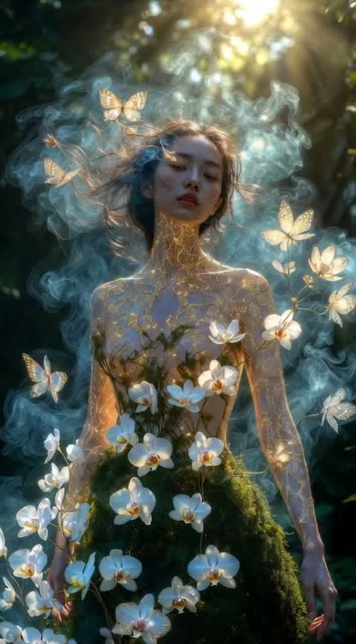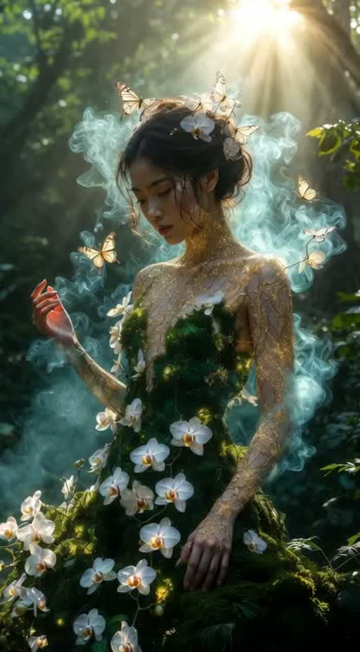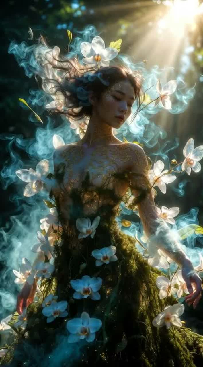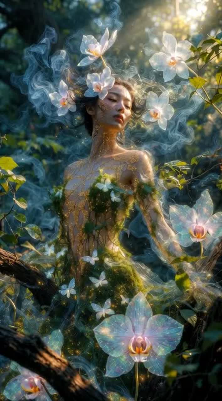 A slow, flowing ethereal Mandopop ballad opens with delicate acoustic guitar and gentle harp arpeggios, supported by soft wind chimes drifting through high-reverb space, Lush strings swell gracefully beneath breathy, airy female vocals, weaving an acoustic folk warmth into the expansive soundscape