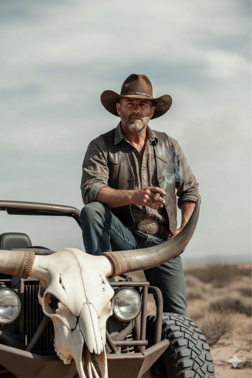 Dark Country Rock / Outlaw Country / Cinematic Western Rock, modern high-production sound, gritty desert atmosphere, epic and emotional, 92 BPM, D minor, halftime groove, Male baritone vocal, raspy and confident, calm outside but dangerous inside, storytelling delivery, Heavy stomp percussion + deep kick/snare, dusty acoustic guitar, gritty bass, subtle banjo texture, slide guitar hooks, electric guitar swells, distorted guitars exploding in chorus, cinematic low strings, sparse piano accents, wind/desert ambience FX, Song dynamics: minimal verse, tension rising pre-chorus, HUGE anthemic chorus, emotional cinematic bridge, final chorus massive with layered harmonies, Lyrics concept: lone cowboy, skull on the hood, desert justice, vengeance vs honor, silence as a weapon, storm inside, walking away while dust rises, Mixing: wide stereo guitars, punchy drums, deep bass, cinematic reverb, modern mastering, dramatic build