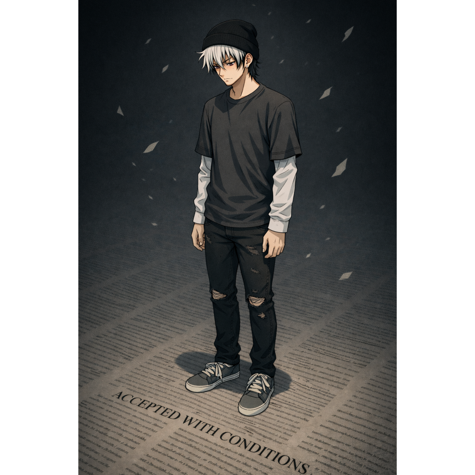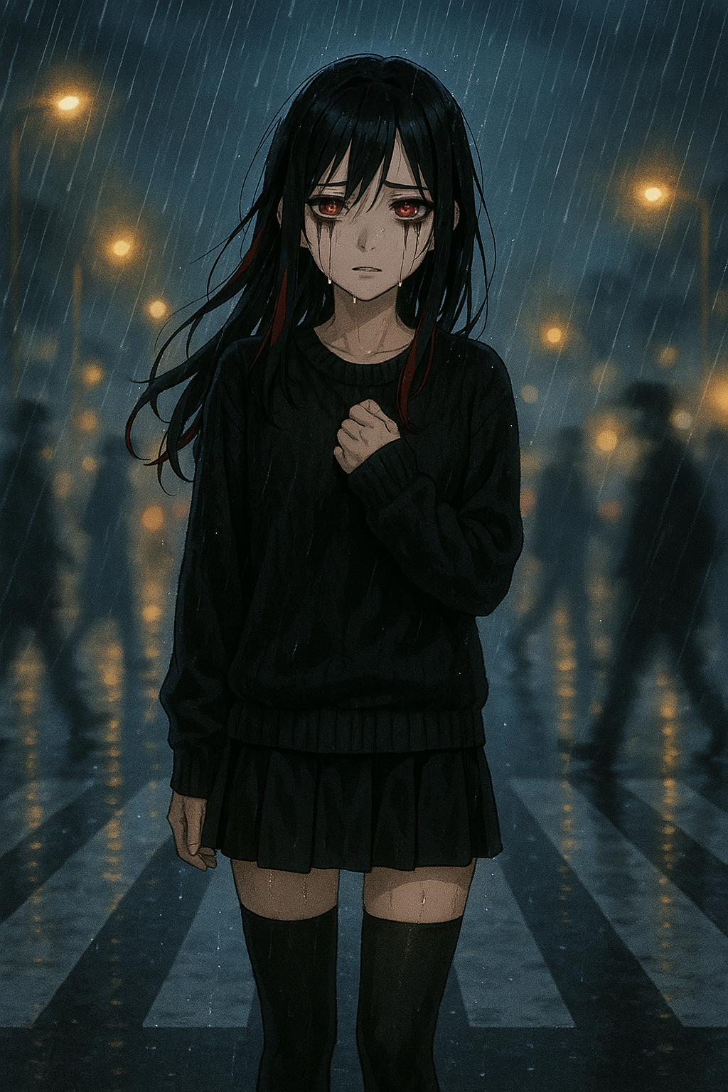 This emo grunge track opens with rain field recordings and subtle trap hi-hats, blending into warm acoustic strums layered with distorted electric guitar fills, Low, smoky vocals deliver whispery, cracked confessions in each verse, shifting to raw, aching belts in the chorus, Soft, punchy heartbeat-following bass underpins lo-fi, dynamically messy drums, Occasional spoken-word fragments float in, voice trembling and anxious, The intimate reverb and bedroom production create a fragile, emotional atmosphere throughout