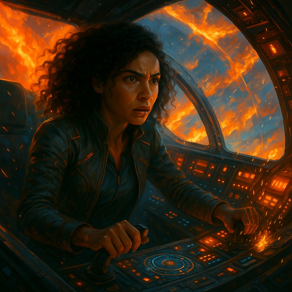 soulful female vocalist, electro-cinematic, dark pop, space trap, futuristic, galactic, space air fight, heavy 808s, glitchy vocal chops, urgent, space sounds