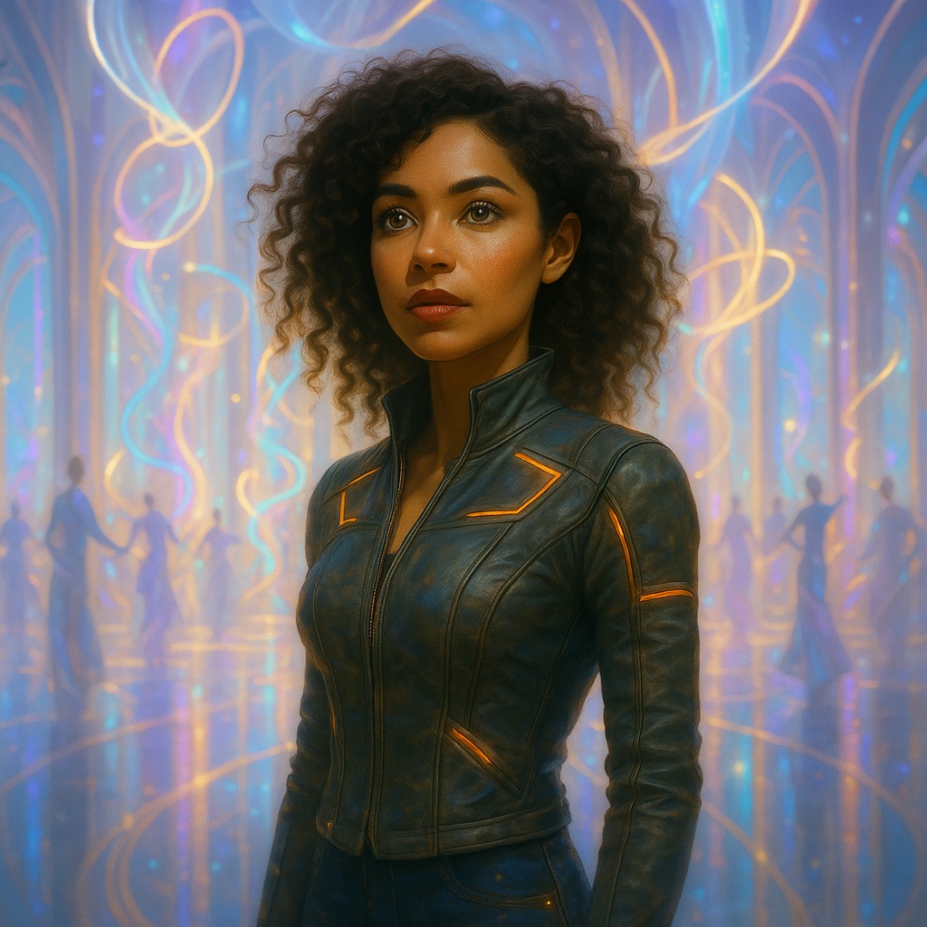 soulful female vocalist, galactic R&B, alt-R&B, space pop, futuristic, upbeat, atmospheric, melodic, eerie, dreamy, harp-like plucks, space sounds