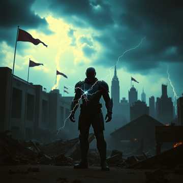 Heavy metal album cover style, dark stormy atmosphere, rain falling over a lone figure standing in shattered ruins, glowing embers drifting through the air, emotional numbness, cold blue and red lighting, dramatic shadows, gritty texture, intense mood, inspired by early 2000s metalcore aesthetics, Bullet for My Valentine energy, high contrast, cinematic, raw emotion