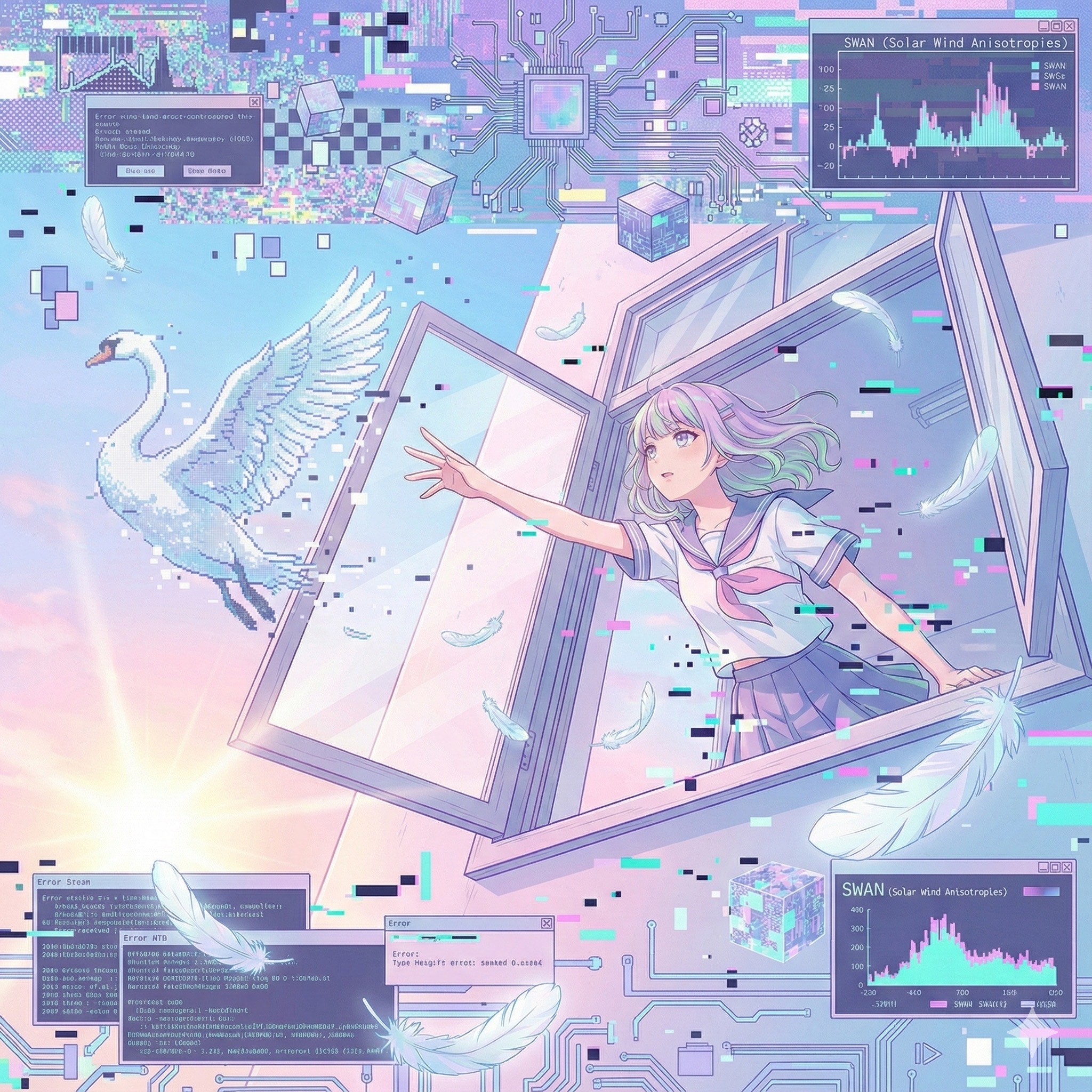 [Vocal] Japanese female vocal with airy synthetic tone, soft highs, micro-fracture edges, slight glitch crackle, minimal vibrato, close-mic clarity, [Sound] Glitch Rock with high-definition mix, bright top end, tight lows, clean stereo image, controlled dynamics, subtle digital clipping, granular dropouts, short noise bursts, slice-stutter accents, [Guitar] Dual 7-string D-modal, clean+chorus vs light-drive, hard-panned L/R, tight 16th picking, controlled palm-mutes, light glitch chokes, brief resample jitter, shimmer-delay tails, [Bass] Pick-style mid-growl, mild drive, tight phrasing, small glitch moves, stable rhythmic support, [Drum] Crisp modern J-Rock kit, sharp kick-snare, subtle gated room, machine-like flams, light glitch fills, [Tone] cold, bright, minimal, digital-fractured, zero-hue, ‑gospel choir, ‑humming, ‑warm vintage tone, ‑heavy reverb wash, ‑soft pop sheen, ‑loose timing