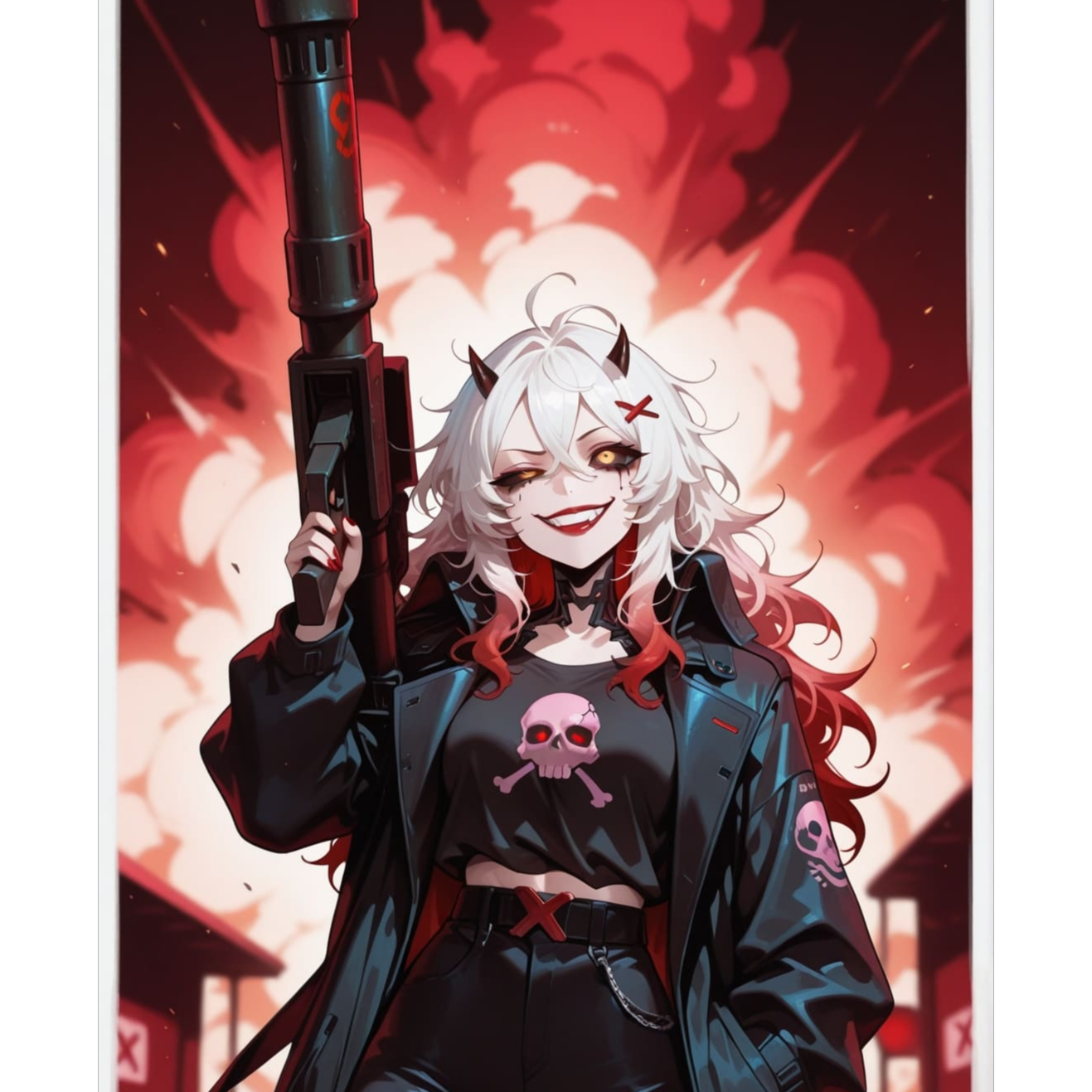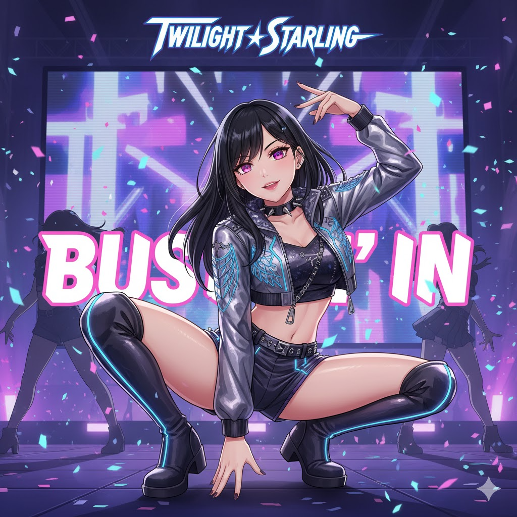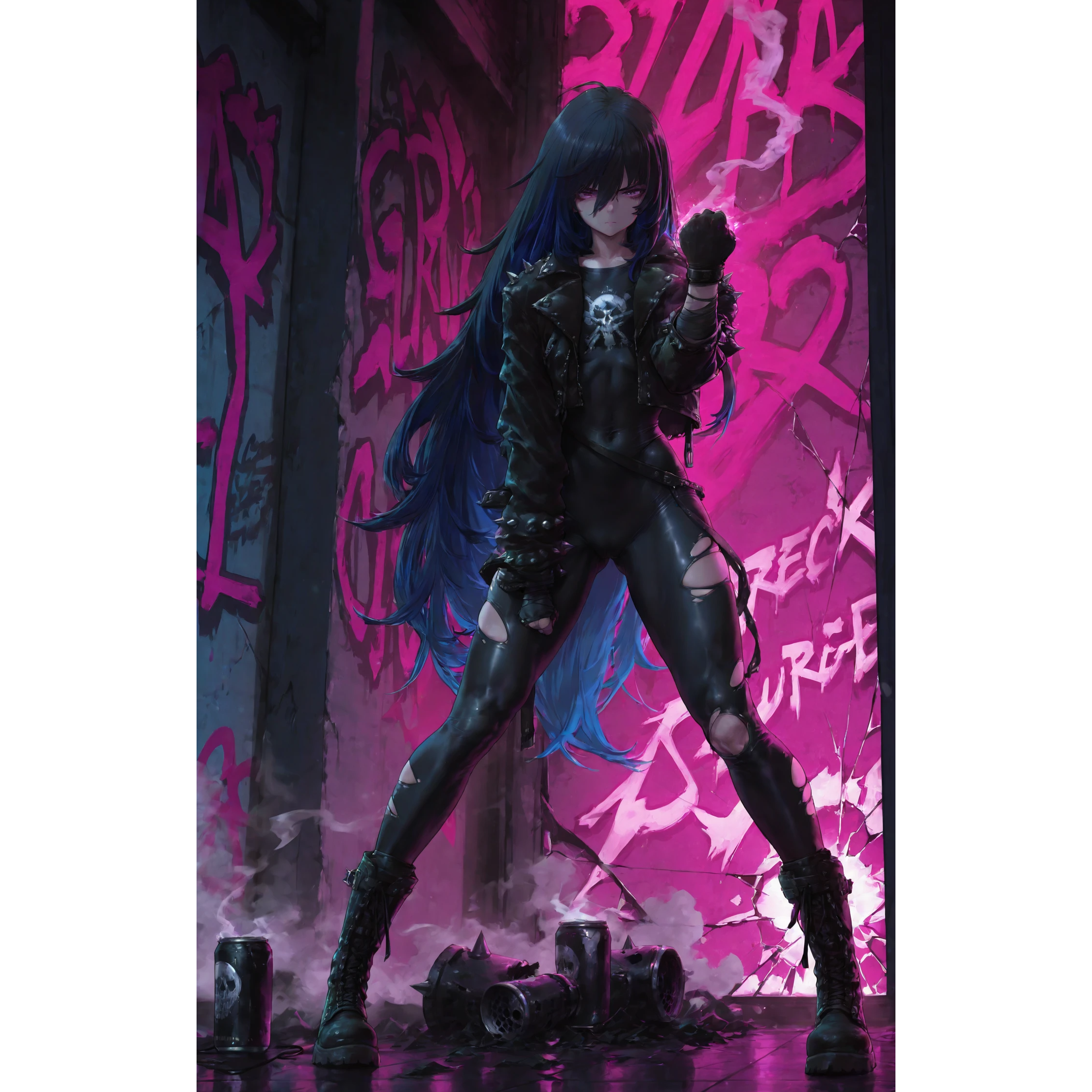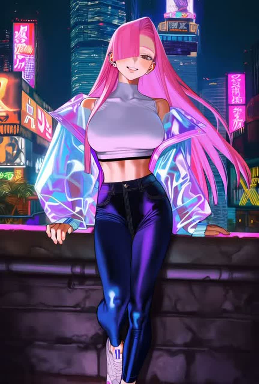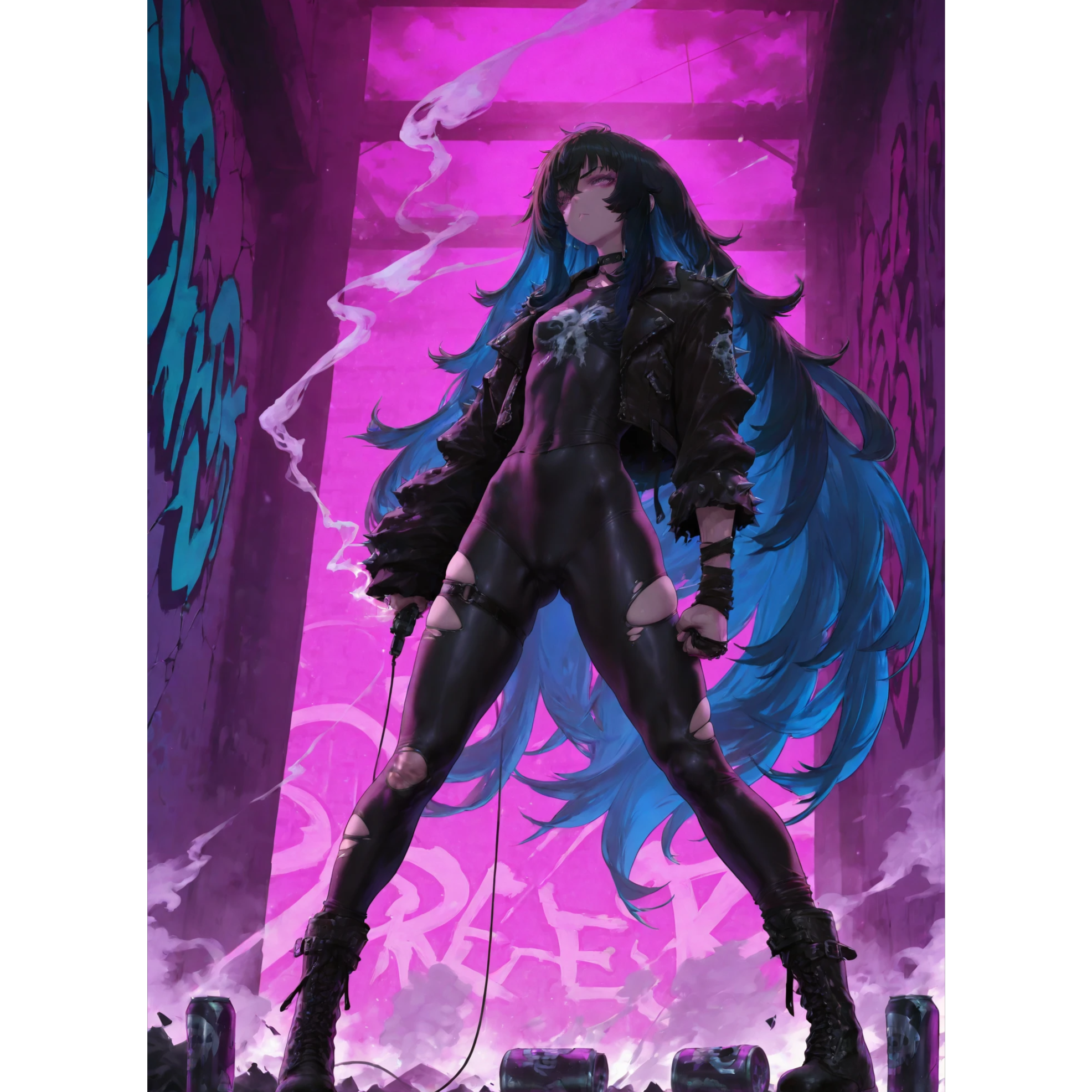 gangster, trap, cyberpunk, hip-hop fusion, industrial, female vocal, confident female rapper, clean production, dynamic audio, wall of sound, street edge, crowd clapping sample, Japanese accent female