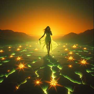 Candy barefoot goddess crowns the flame, caramel curls spill sovereign light