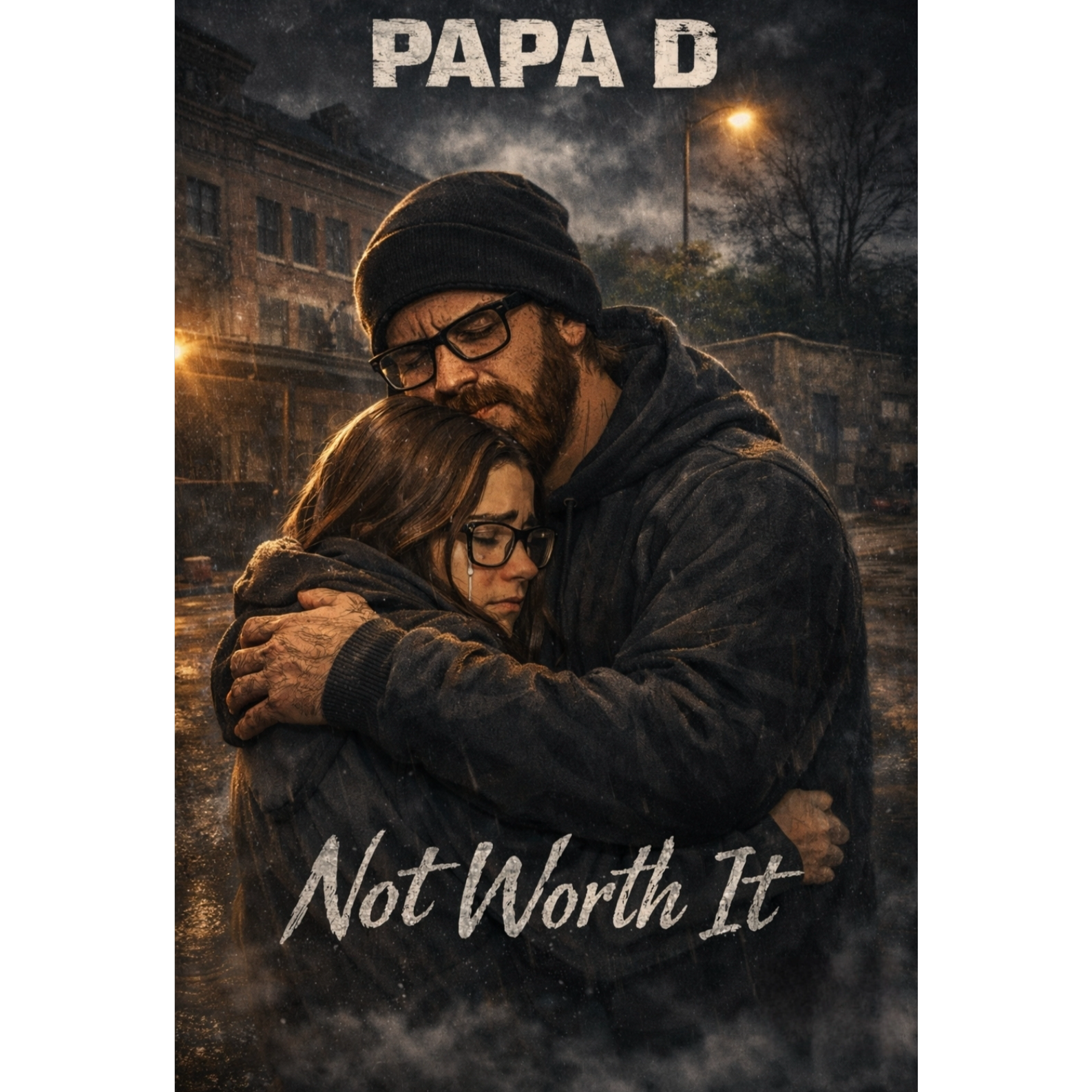 Male and female duet: Papa D and his daughter, Dark pop ballad with cinematic edge—intimate felted, close-miked piano, warm analog pads, and lush strings (low cellos for weight, expressive violas, soaring legato violins in the chorus, subtle pizzicato for tension), Deep sub-bass swells and sparse trap-influenced percussion (soft 808 kick, rim clicks, airy hats) bloom in the hook, Vocals trade and intertwine: Papa D’s textured, emotive baritone—gritty low-mid presence, mostly dry with slight slapback—balances his daughter’s breathy-to-belting lead with plate reverb in the chorus, Verses feel conversational and intimate; pre-chorus builds with low drones, reverse FX, tremolo strings; chorus opens wide with stacked harmonies and octave doubles, Bridge drops drums—father and daughter over piano and distant strings, Final chorus swells with layered harmonies and heavier low end, Mood: heartbreak to healing, strength through family, Warm, glossy mix; modern master, A Minor, 78 BPM