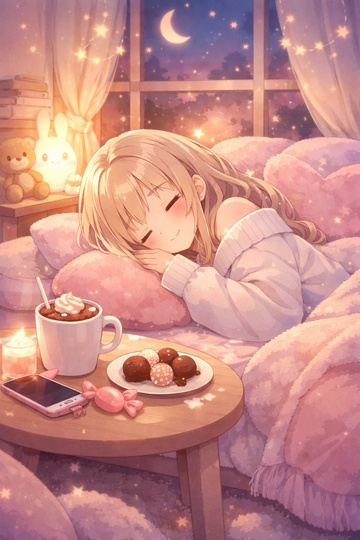 Atmosphere: Late-night, cozy bedroom, pastel colors with a hint of shadow