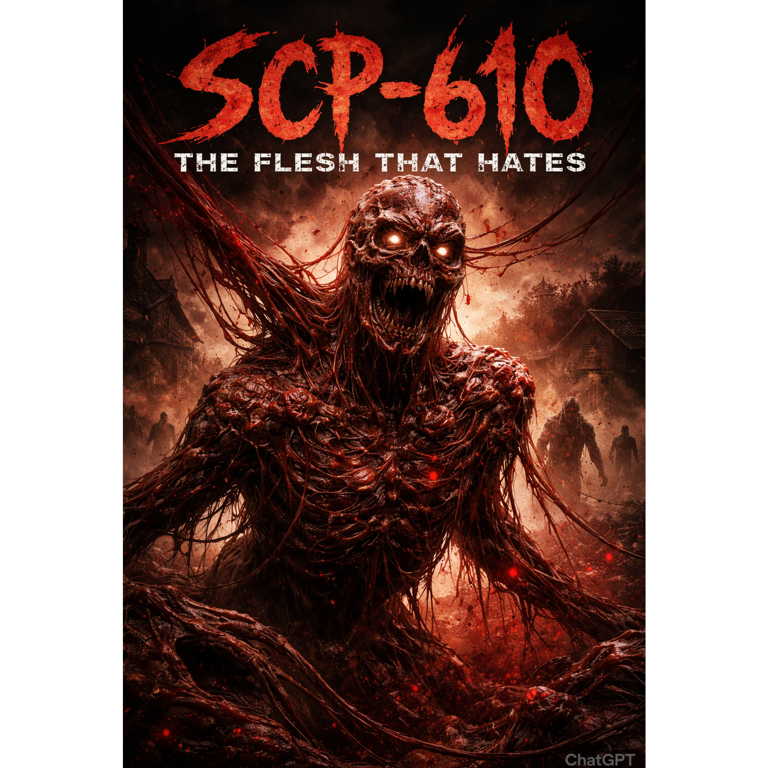 Instruments: distorted guitars, heavy industrial drums, deep synth bass, harsh noise textures, low choir pads, metallic impacts, Vocal style: aggressive lead with mix of clean singing and screams; distorted backing vocals in chorus, Arrangement: Intro (distorted radio) → Verse → Pre-Chorus → Chorus → Verse → Pre-Chorus → Chorus → Bridge (breakdown) → Final Chorus → Outro, Mood: viral apocalypse, body horror, unstoppable spread, Sound cues: wet tearing textures, radio static, distant screaming when SCP-610 is mentioned