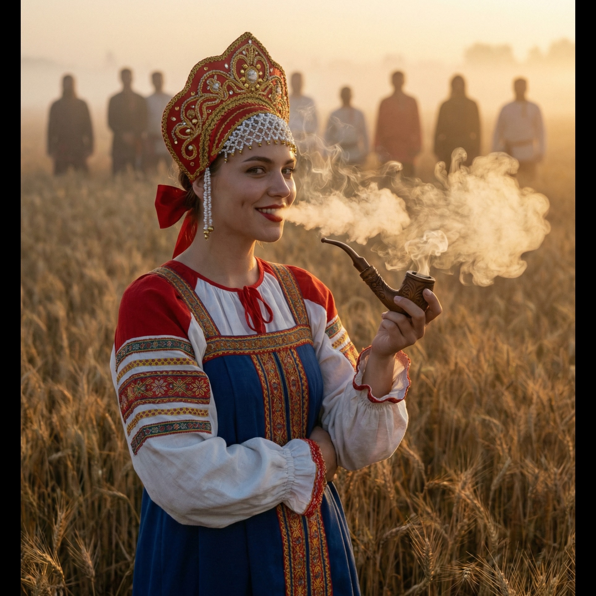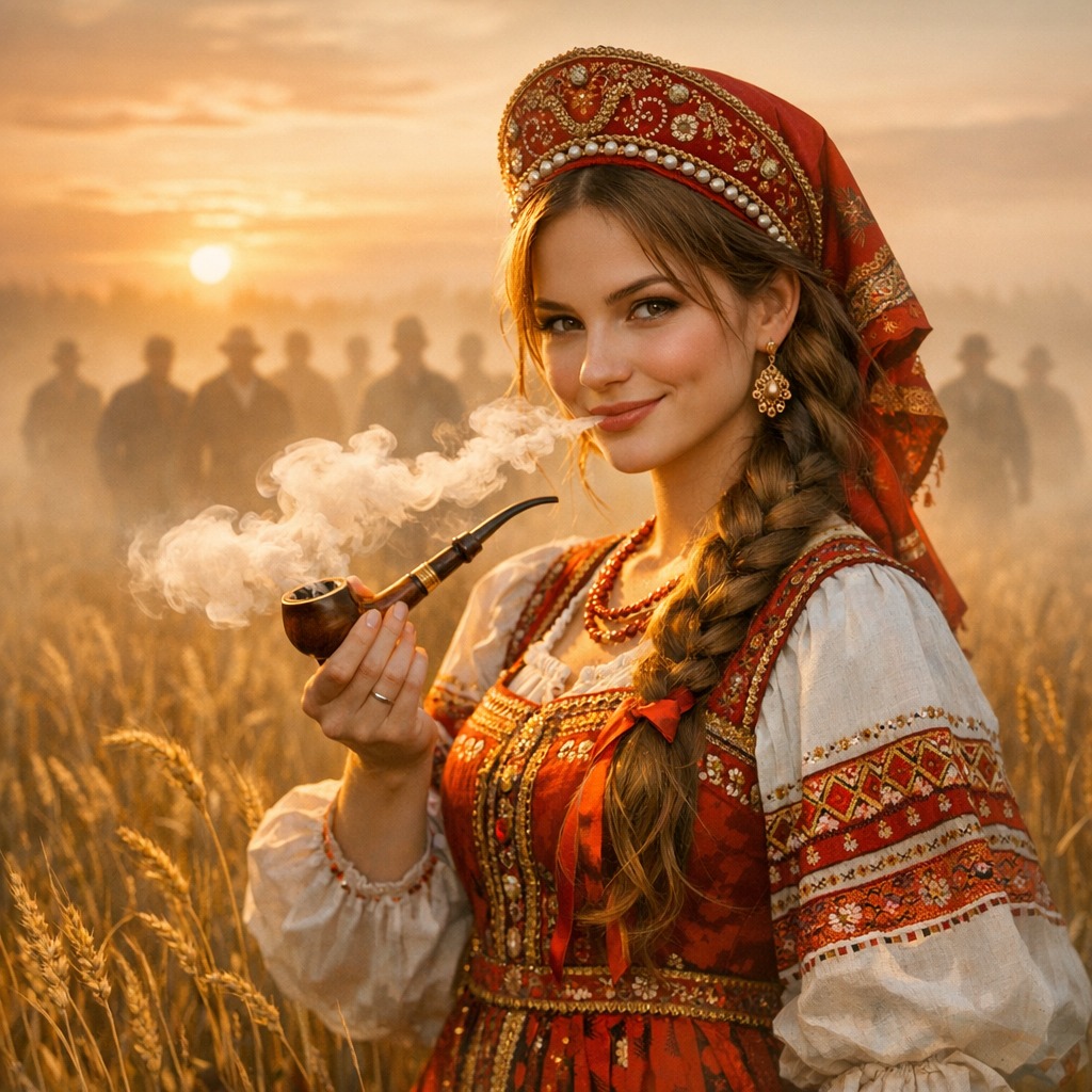 Russian folk-pop, Electronic Dance Music, Synth-Brass, 124 BPM, 4/4 time, Female Vocal, Minor Key, Sidechain Compression, Slavic Accordion, Dance Pop, Ethnic Fusion, Staccato Vocals, Filter Sweeps, Reverb, Punchy Kick, Sub-Bass, Rhythmic Chanting