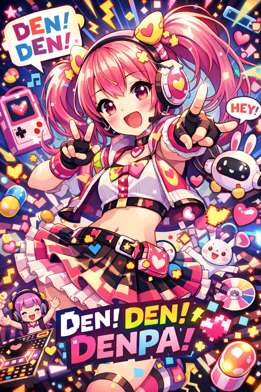 Hyper-tempo electro pop with denpa elements, bright and chaotic mood, Cute but aggressive female vocal, very fast rap-like delivery with dense rhymes, Playful electronic synths, chiptune sounds, bouncy bass, sharp rhythm, High energy, catchy and addictive chorus with heavy repetition, J-pop meets denpa song and hyper pop, fun, noisy, and colorful chaos, BPM 170–190, upbeat, cheerful, slightly unhinged but cute, kawaii denpa style, anime-like vocal expression, playful chaos, fast-paced rhythmic vocal, rap-inspired phrasing, tongue-twister flow, extremely catchy hook, loopable chorus, earworm melody, Female vocal, cute, energetic, high-pitched, fast articulation, playful tone