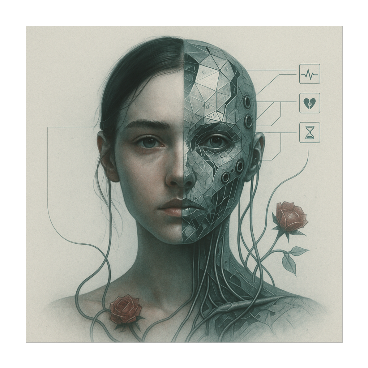 3/4, 100 BPM, Key: C# minor, metallic percussive hits, bit-crushed snares, saturated synth-bass, bright distorted lead synth answering vocal lines, call-and-response hooks, chorus minimal lyric mantra with huge sidechain, bridge: glitch cuts + formant-shift whispers, fx: chorus on pads, parallel distortion on drums, mood: tender core wrapped in chrome
