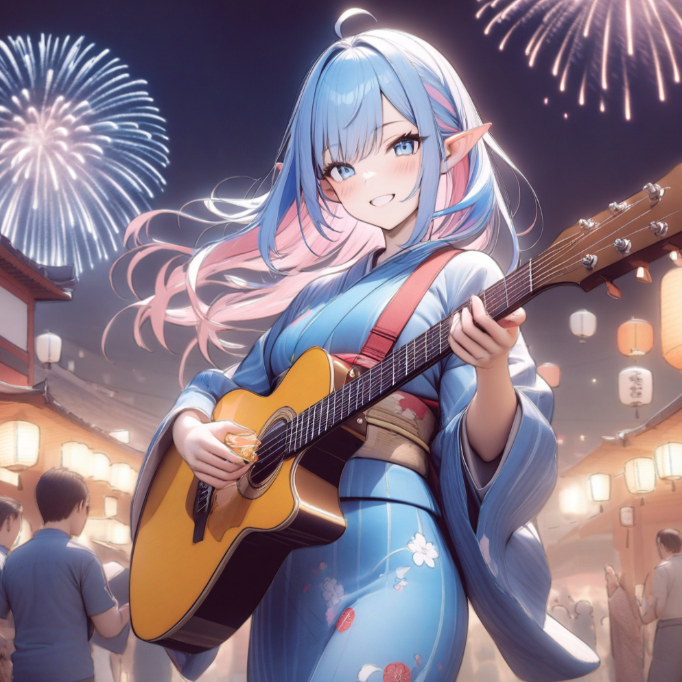 A lively J-pop arrangement evokes 夏祭り with bright acoustic guitar, festive percussion, and playful synth layers, During [打ち上げ花火], the instrumentation swells as taiko drums and brass fanfare mimic fireworks, with sparkling keys and dynamic cymbals that rise to a dramatic climax