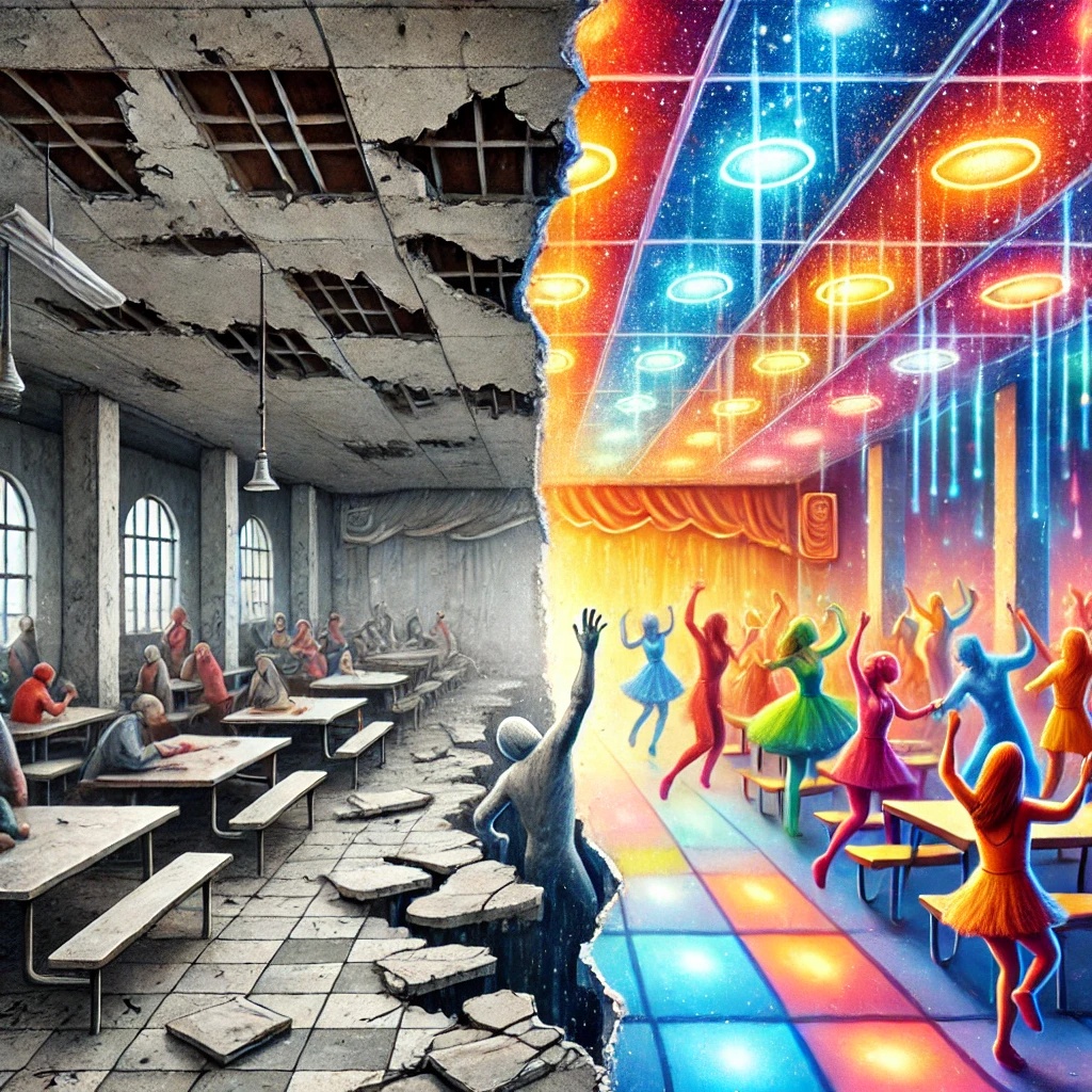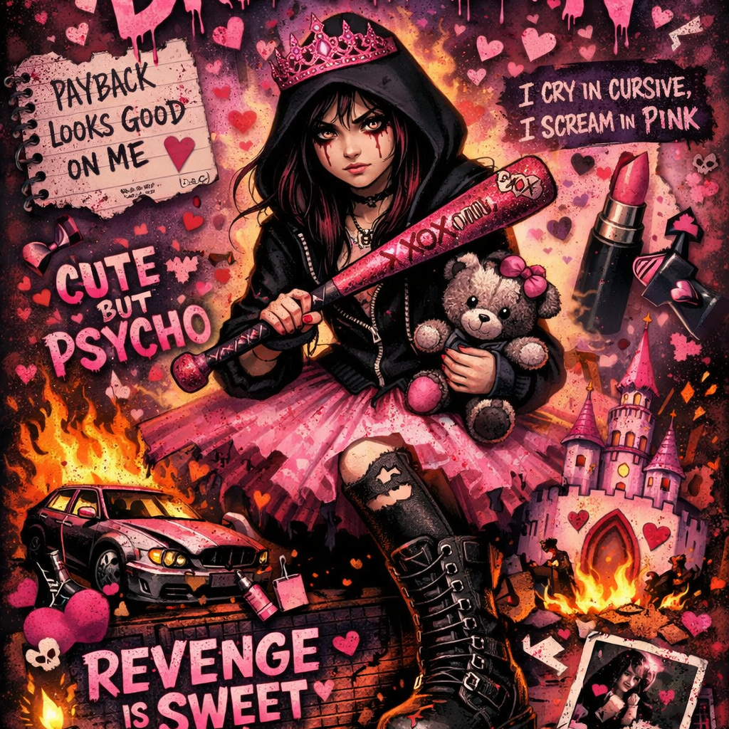 Girly Girl Soaring Female Vocals, screamo, Pop-punk into metalcore, theatrical flair, screamo/clean vocals, chaotic riffs, glitch FX, quirky orchestral hits, Dark humor