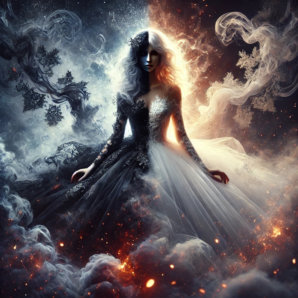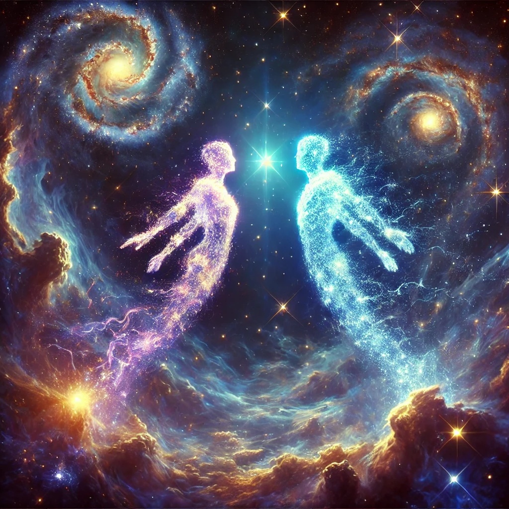 2020s Cinematic Synthwave, Ethereal female and male duet vocals, Atmospheric electronic layers, Deep basslines, Sweeping orchestral strings, Pulsing beats, Themes of love, loss, and cosmic journeys