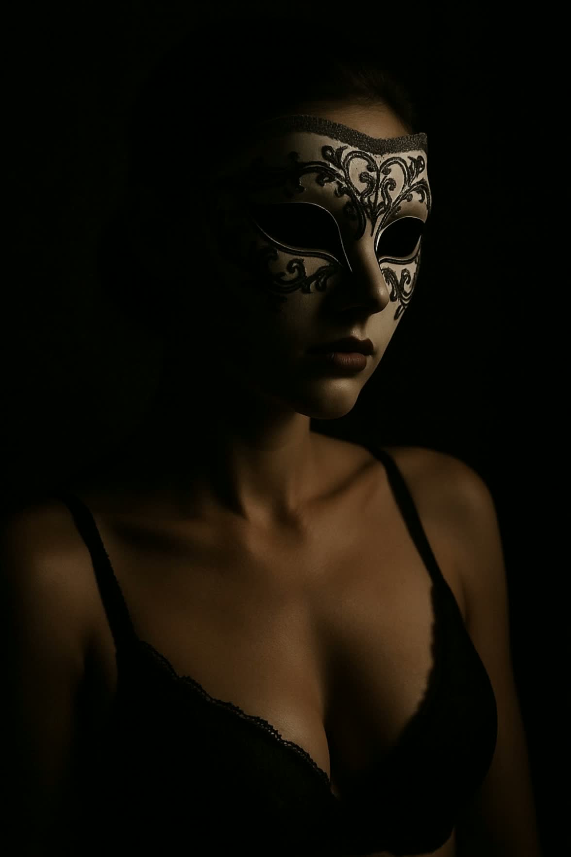 Rhythm: Deep steady kick, pulsing sub-bass, Sparse percussion, brushed hats, hypnotic groove, Atmosphere: Spacious pads, faint piano stabs, airy reverb swells, Vocals: Female only, Whispered mantras, sighs, moans, Words broken, echoed, reversed, Mood: Erotic, Hypnotic, Roleplay fantasy, The mask hides her face but frees her body