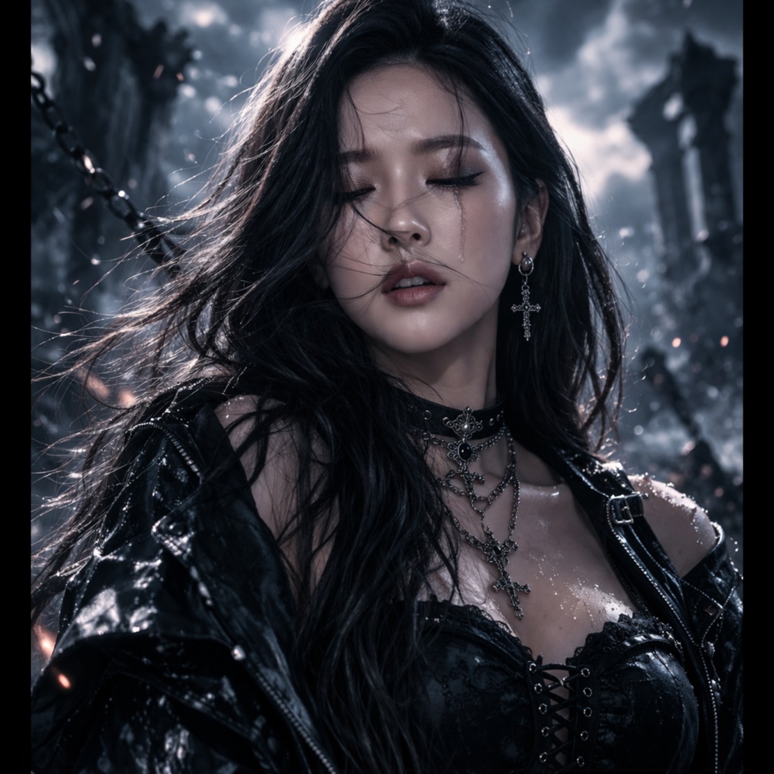 High clear female vocal / Symphonic speed metal with classical drama at 150–170 BPM, driven by relentless 16th-note double bass drums creating powerful galloping momentum; a solid 8-beat rock foundation layered with fast 16th-note hi-hat and kick embellishments for added density and urgency, aggressive snare accents and dramatic tom fills, distorted guitars with neoclassical shredding and harmonic minor melodies, melodic bass locked tightly to the double kick, cinematic strings and piano building tension before explosive climaxes, and theatrical high-range female vocals shifting between soaring power, cold elegance, and emotional softness, creating an epic, tragic, and explosive atmosphere that blends beauty with intensity