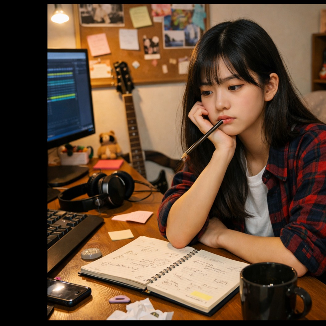 Fresh, youthful K-pop girl group hip-hop vocals by a small female ensemble, Light, natural-toned rap delivery with relaxed phrasing, moving smoothly between soft low-mid chest voice and airy, clear idol rap, Primary rappers deliver fast but effortless flows with a conversational feel, precise timing, and minimal aggression, Supporting members add bright, breezy backing vocals, subtle unison hooks, short playful ad-libs, and gentle call-and-response that feels casual and intimate, Rap sections feel loose and rhythmic rather than forceful, with clean articulation and an easy, almost spoken groove, Overall vocal character is cool, youthful, and understated, playful yet nonchalant, modern K-pop hip-hop with a diary-like, everyday mood, No heavy belting or dramatic singing; focus on light, rhythmic vocal delivery and natural group chemistry, ‑No solo vocalist, ‑No male vocals, ‑No power belting or dramatic emphasis, ‑No R&B runs or soul ad-libs, ‑No aggressive or shouty rap, ‑No whisper-only vocals