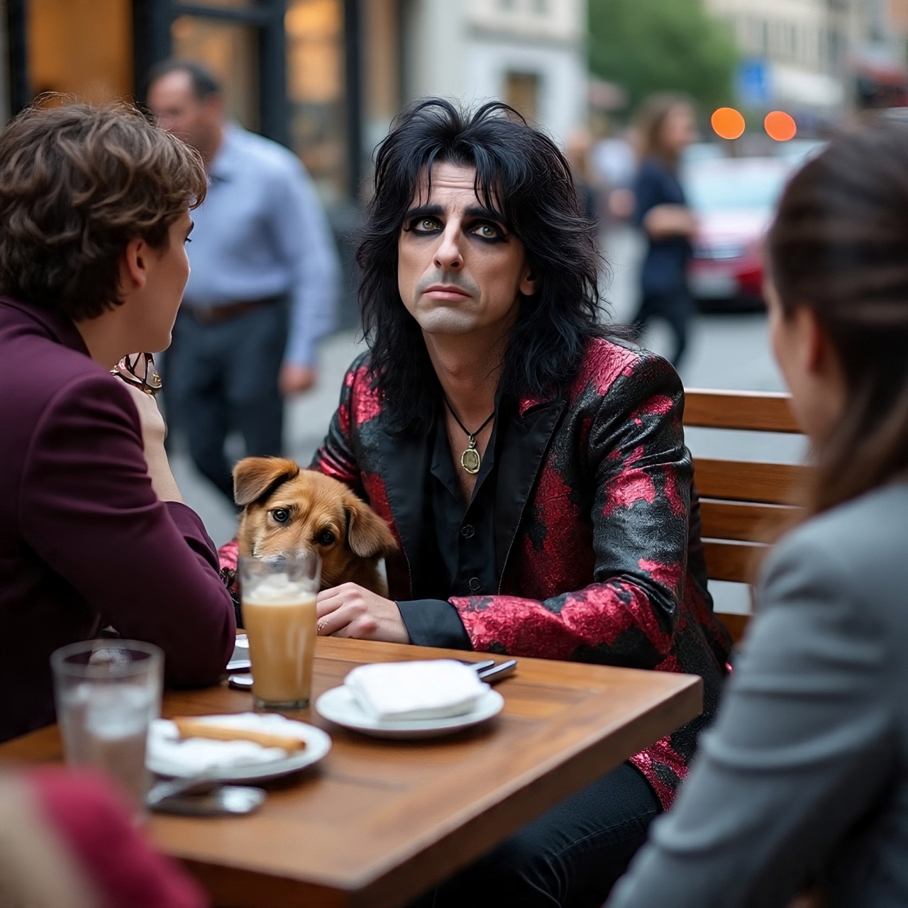 1972 hard rock, glam rock, proton-punk, garage rock, shock rock vibe, Prominent distorted electric guitars with punchy riffs and occasional melodic hooks, Bedrock guitar riff, Guitar slides or squeals for atmosphere, Driving, groovy bass line with occasional walking or syncopated patterns, Energetic drums with tight snare hits and occasional dramatic fills, Occasional keyboard and organ for atmospheric, slightly creepy undertones Dynamics shift between verses (more restrained, suspenseful) and choruses (full, explosive, high-energy), Male lead vocals, theatrical and slightly raspy, Over-the-top, dramatic delivery with occasional playful snarls and exaggerated inflections, Storytelling, theatrical, sung to emphasize dark humor and absurdity, Bridge can have suspenseful or eerie instrumental breaks to build tension, Catchy, Melodic, Memorable