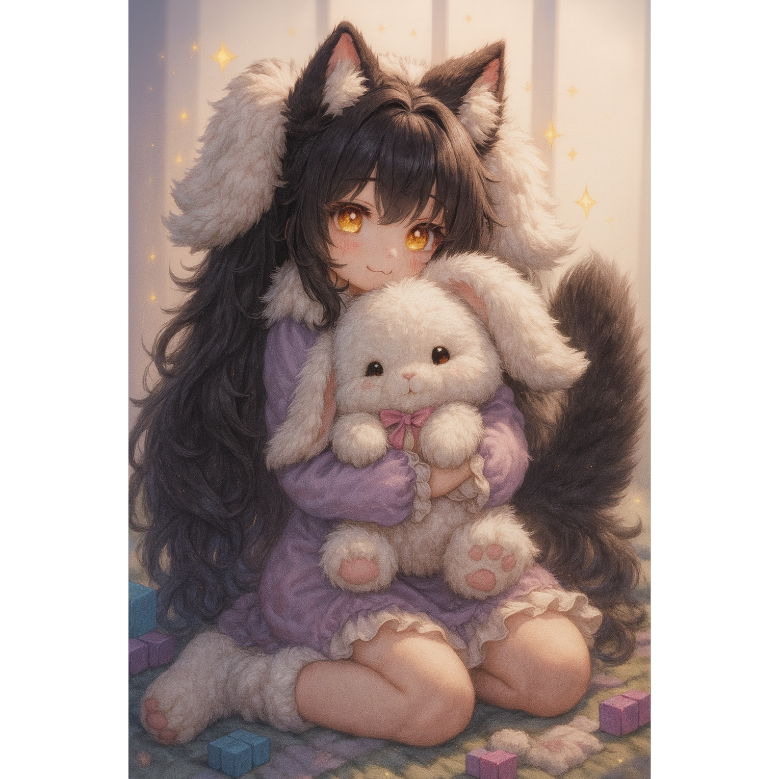 A kawaii alt pop lullaby blending darkwave synth pads and playful music box melodies, with bright, cute piano leading the verses, Toy percussion clicks and chimes dance around fingerpicked acoustic guitar, Twinkling textures and gentle bass create a dreamy, childlike atmosphere throughout