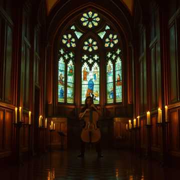 Instrumental track of progressive folk with dark cabaret influences, dominated by cello and flute, in sentimental and nostalgic mood, 80bpm, recorded in a church with good reverberation, ‑Drums