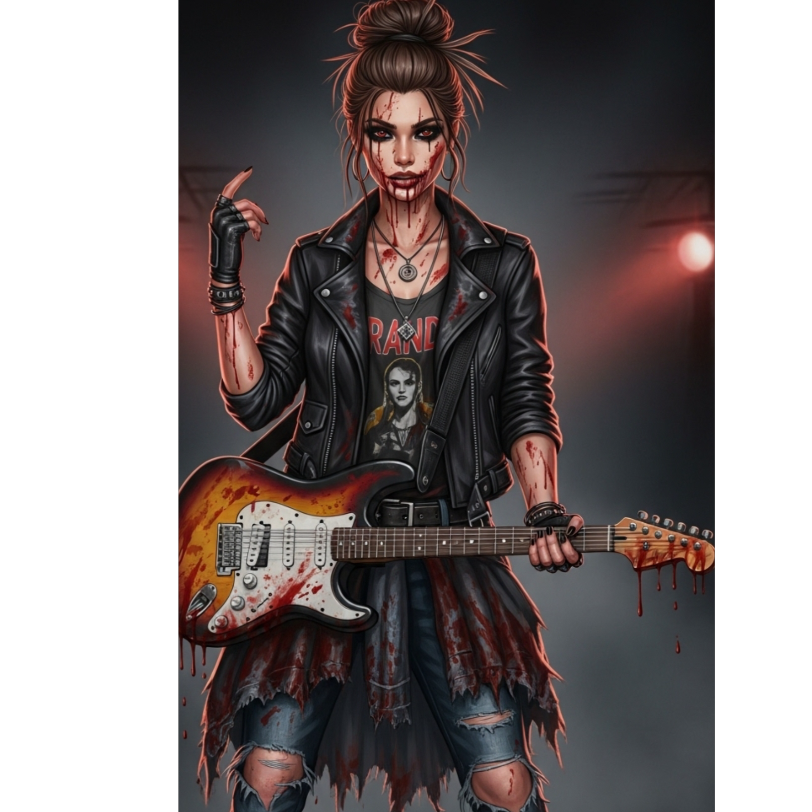 Hard Rock × Gothic × Halloween Anthem — driven by heavily distorted electric guitars, a deep bass groove, and powerful drums, layered with haunting pipe organ tones and a touch of dramatic horns, The vocal delivery is languid yet passionate, teetering between love and madness, echoing through the night with a raw, emotional intensity, It’s a darkly theatrical soundscape, blending rock’s fiery rebellion with gothic grandeur and a Halloween mystique, female vocals