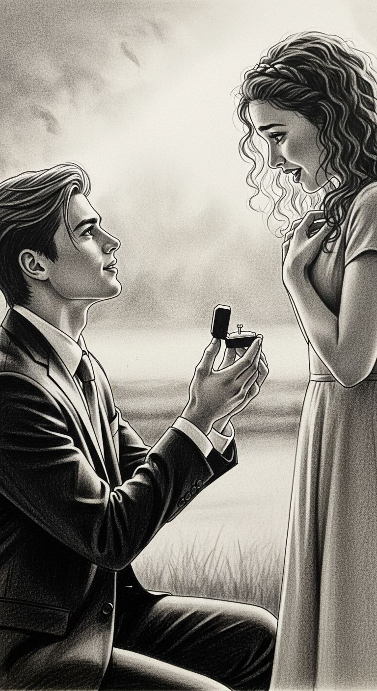 Emotional romantic ballad style, gentle male vocal, soft piano and strings arrangement, warm cinematic atmosphere, slow tempo, heartfelt storytelling, proposal moment, quiet night city lights, intimate and sincere tone, deep emotional build-up, tears and smiles, orchestra swell at the climax, hopeful and timeless love theme, deep reverb vocals, subtle acoustic guitar, warm light bokeh, soft wind and candlelight mood