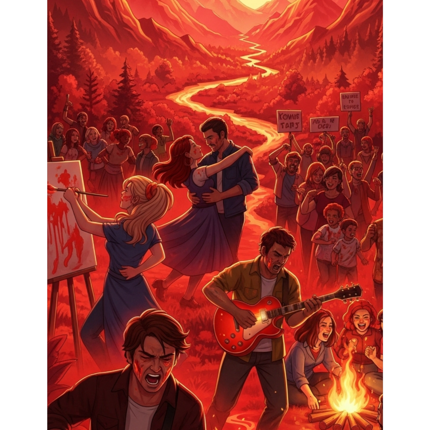 Intro: Shamisen and drum roll set the tone — a blend of elegance and intensity, invoking the image of a sacred procession beneath crimson skies, Pre-Chorus: Taiko drums and shakuhachi create a ceremonial tension — the heartbeat of an ancient celebration turning into fire, Guitar: Deep reverb, shimmering and flickering like kitsune fire, weaving mystic melodies between riffs, Bass: Rooted and heavy, but with a subtle swing — a steady pulse grounding the spiritual chaos, Vocals: From whispered breath to passionate roar — carrying raw emotion, love, and madness; the voice of a soul dancing between blessing and curse