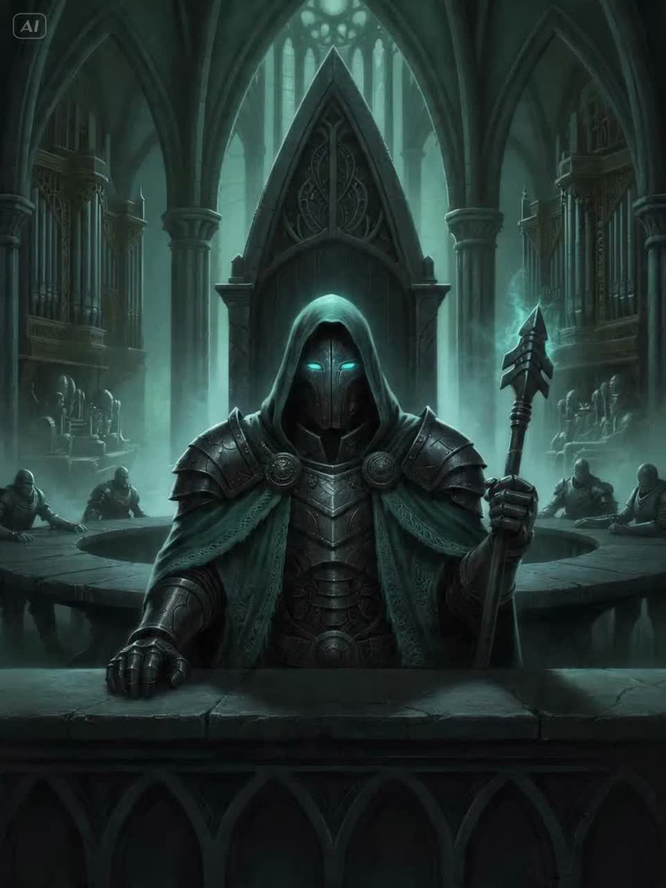 Dark sacred cinematic – deep male choir (latin-style, non-lyrical), slow dominant tempo, massive cathedral reverb, low war horns, subtle orchestral layers, heavy but restrained drums, cold atmosphere, divine and intimidating presence, elegant menace, no chaos, no techno, pure authority, no vocals