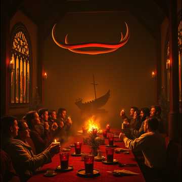 Style: Viking folk sea shanty verses with soaring clean gang vocals → crushing death metal choruses with guttural roars and blast beats, Instruments: Tagelharpa and bowed lyre carry the melody, joined by pounding war drums, distorted guitars tuned to open C, and a low-throated horn that sounds like a dying mammoth