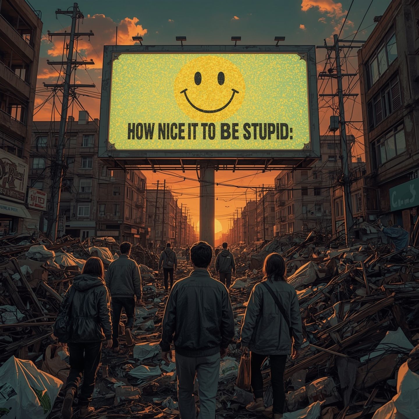 Sound: Mechanical groove, heavy beat, ironic anthem vibe — like a dark protest song for the age of stupidity