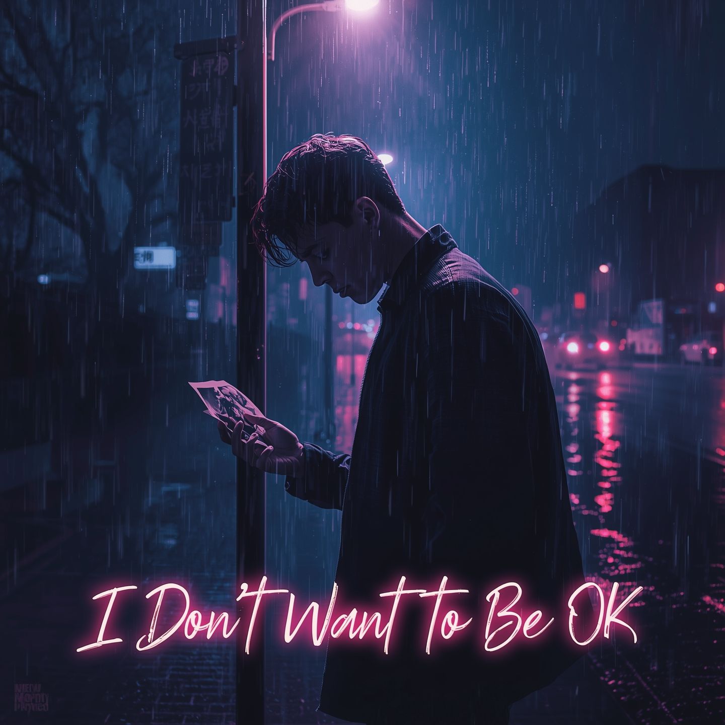 Guitars: clean electric arpeggios in the verses with light chorus effect; powerful distorted rhythm guitars enter in the chorus for emotional punch, Bass: warm, steady low-end driving the emotion, following the vocal phrasing in the verses and locking tight with the kick during the choruses, Drums: dynamic — soft hi-hat and snare in the verses, exploding into full crashes and tom fills in the chorus, Synths/Pads: subtle ambient layers under the verses, wide reverb for atmosphere, giving the song a cinematic feel, Vocals: passionate male lead — clean, emotional, slightly raspy on the high notes; background harmonies echoing key lines in the chorus (“I don’t want to be OK”), FX: light delay on vocals for depth, reverb-heavy snare for open room feel, Tempo: mid-tempo (90–100 BPM), Key Emotion: heartbreak, defiance, self-reflection, Overall Tone: melancholic but empowering — a modern breakup anthem for those who refuse to settle for “OK, ”