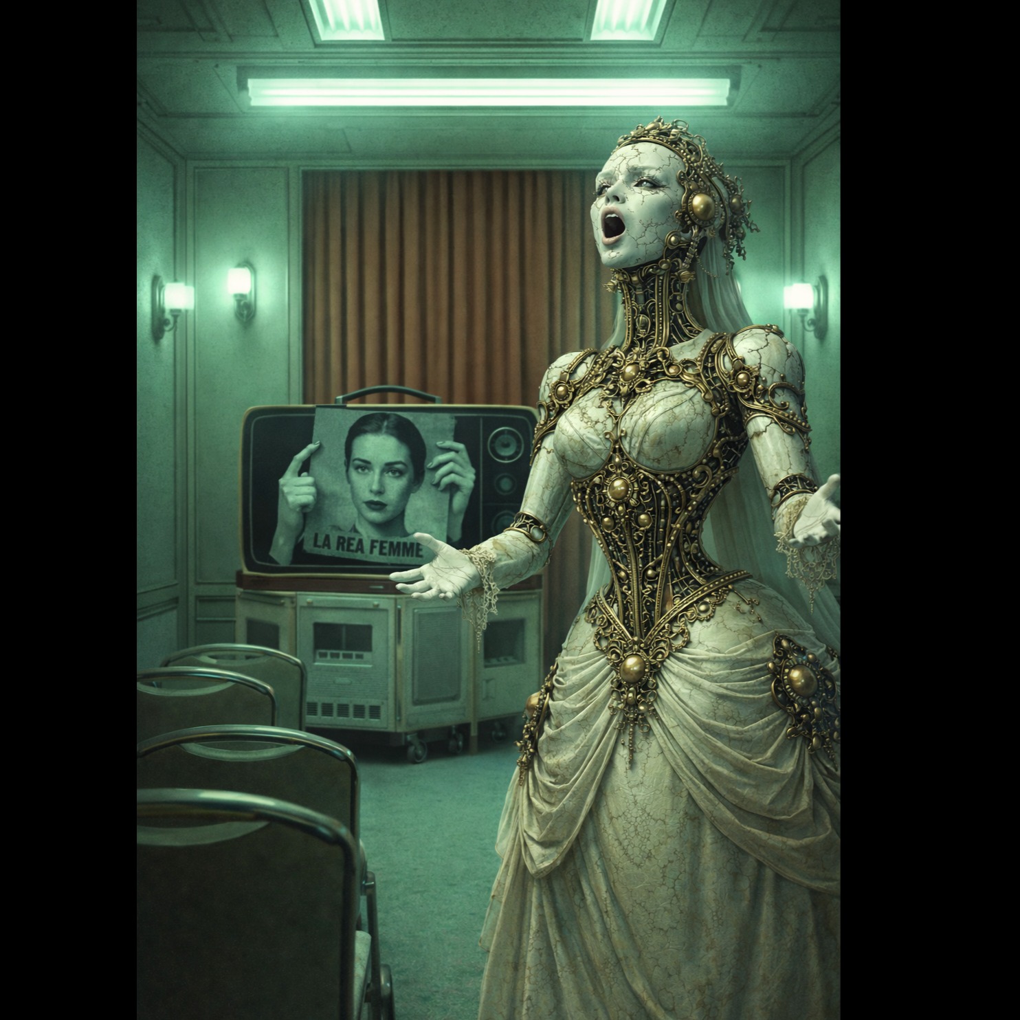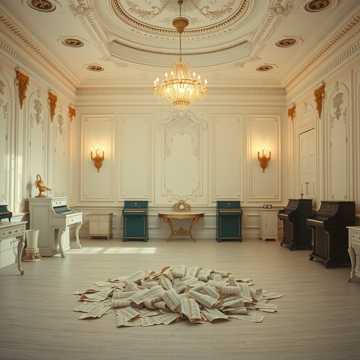 Uncanny 5/4 haunted waltz, sanitized ballroom atmosphere, Harmony centered in Phrygian (tense b2 prominent in verses), with brief Locrian instability in bridge (diminished cluster under vocal) and subtle Lydian #4 shimmer only in high chorus textures, Detuned harpsichord with gentle wow/flutter, frame drum slightly behind the beat (micro-drift), bassoon countermelody, Gamelan bells uneven decay, some choking early, Bowed saw drone like a smile held too long, Vocals: intimate close-mic, slightly breath-delayed attacks, faint unnatural sustain tails, emotionally restrained, almost-correct phrasing â beautiful but subtly hollow, Choir in chorus slightly over-aligned with brief unison âsnapâ moments, Handclaps inconsistently early/late, Low mechanical pulse barely audible beneath warmth, No heroic resolution, Warm-but-sterile, Abrupt mid-phrase cut + single bell