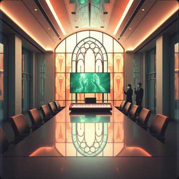 Upbeat gospel-inspired corporate satire, Energetic indie pop fused with modern gospel choir, Bright piano, handclaps, groovy bass, light funk guitar, and joyful choir harmonies, Male lead vocal with call-and-response choir, Cheerful, ironic, celebratory tone, ~115â120 BPM, Big uplifting chorus, playful verses, joyful clapping outro