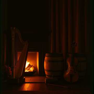 Soft Restful Celtic tavern tune with harp and violin, like falling asleep infront of a warm fire, soft, gentle vocal runs