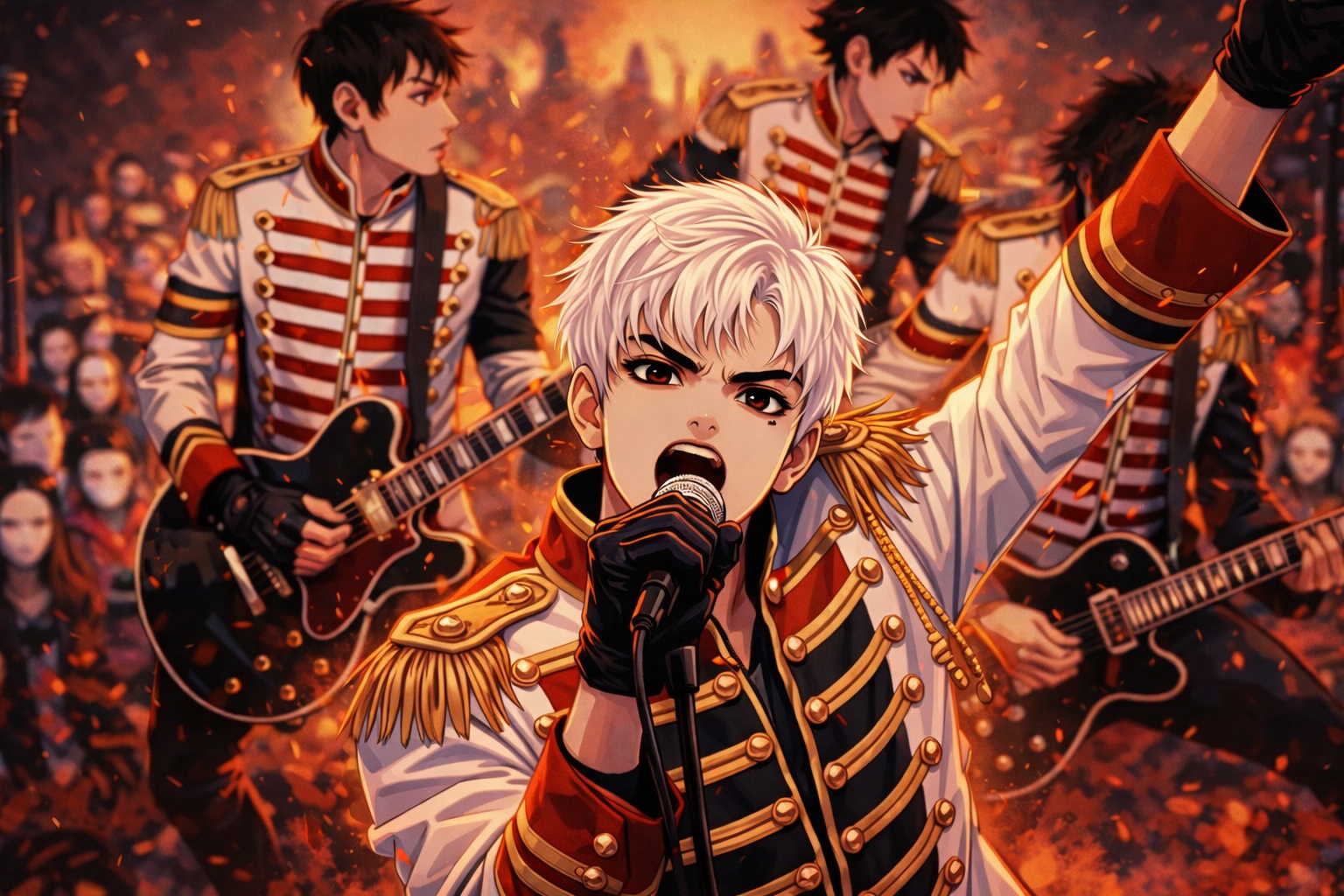 classic crooner, chill hop, theatrical emo, pop punk, alternative rock anthem, rock opera structure, multi section builds, dramatic crescendos, late key lift, piano intro, reverberant keys, marching snare cadence, punchy kick and snare, arena distorted guitars, layered rhythm guitars, soaring lead guitar hooks, melodic bassline, orchestral brass swells, cinematic strings, clean vinyl texture, chopped vinyl chord samples, record scratching, glitch effects, stutter edits, micro cuts, digital artifacts, tight sidechain movement, glossy synth sparkles, bright indie pop polish, ear candy transitions, baritone croon lead vocals, intimate close mic verses, soaring belted chorus, stacked harmony vocals, choir backing vocals, gang shout layers, wide stereo chorus, lush reverb tails, triumphant melancholic, cathartic parade energy, nostalgic cinematic atmosphere