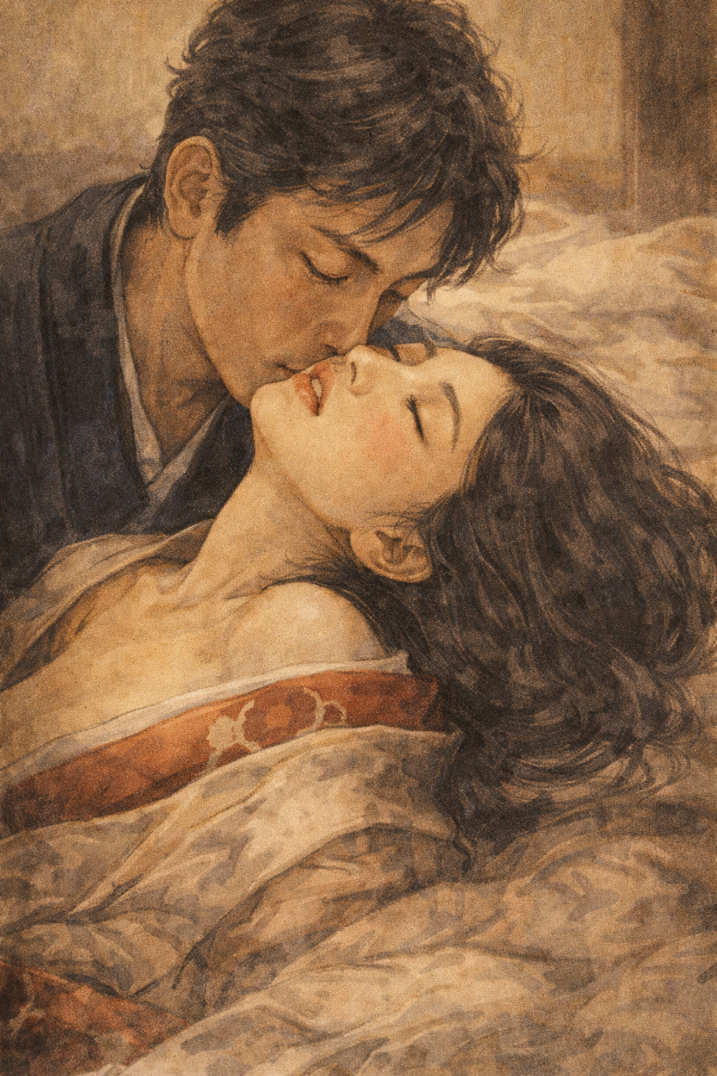 black metal with doom/occult overtones, minor/Phrygian scales, tremolo-picked riffs layered with thick distorted bass lines, drums: blast beats alternating with half-time doom stomps, dynamic fills, guitars: raw, mid-heavy distortion through vintage-style tube amp, eerie dissonant intervals, progressive riff transitions, vocals: alternating between calm philosophical narration (spoken/chant) and grotesque growling baritone screams, ambience: field recordings (temple bells, ghostly winds, cicadas), mix: cavernous reverb, tape echo on vocals, mono-summed low end under 120Hz, dark atmosphere blending 70s Japanese occult rock with contemporary black/doom metal, mood: literary horror, exploring eros & thanatos, unconscious desire, fetish symbolism, eternal possession through destruction