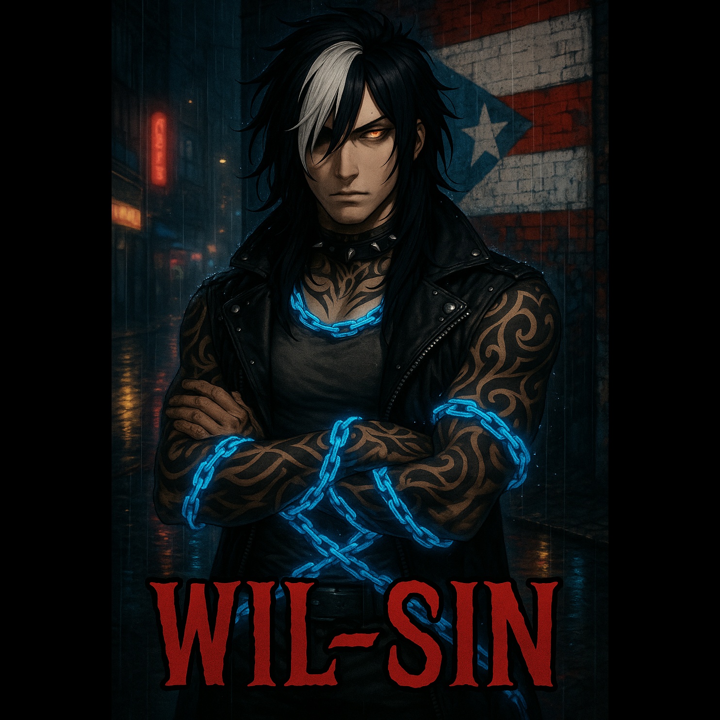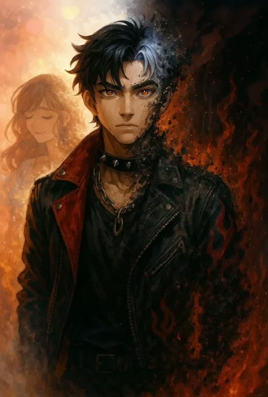 “Cinematic Nu-Metal with Puerto Rican Latin fusion, Heavy distorted electric guitars blended with Latin percussion (congas, timbales), deep 808s, and intense drum patterns, Include emotional build-ups, chaotic breakdowns, and a powerful guitar solo in the bridge, Mid-to-fast tempo with aggressive energy but space for melodic moments, Let the Latin vibe shine through with rhythmic grooves and syncopated breaks that reflect island flavor mixed with metal rage, Cinematic transitions should feel like a movie unfolding — with tension, release, and fire, Vocal setup: Two bilingual vocalists — one smooth and melodic (English/Spanish), the other with deep screamo growls (also bilingual), Use layered vocals, emotional ad-libs, whispers, and dynamic call-and-response between the two voices to express the internal war between love and hate, peace and destruction, Build up to explosive choruses with screaming harmonized by melodic vocals, Keep it dark, passionate, and poetic, ”