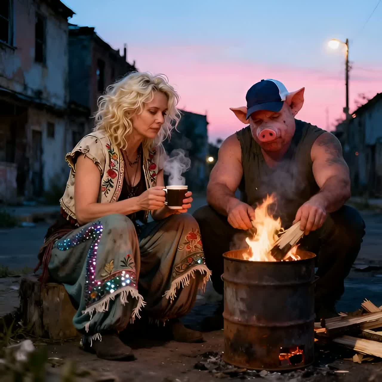 Situation: sitting before dawn around a fire barrel, drinking coffee