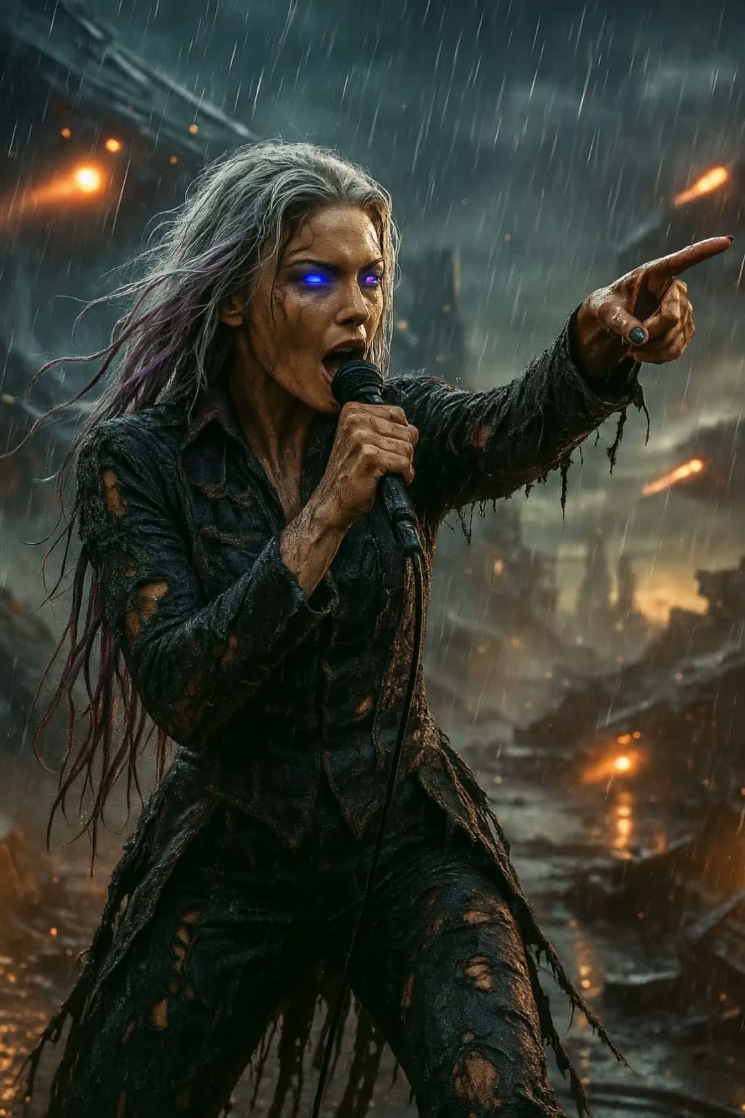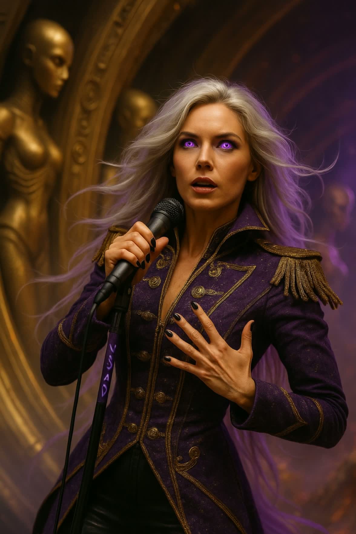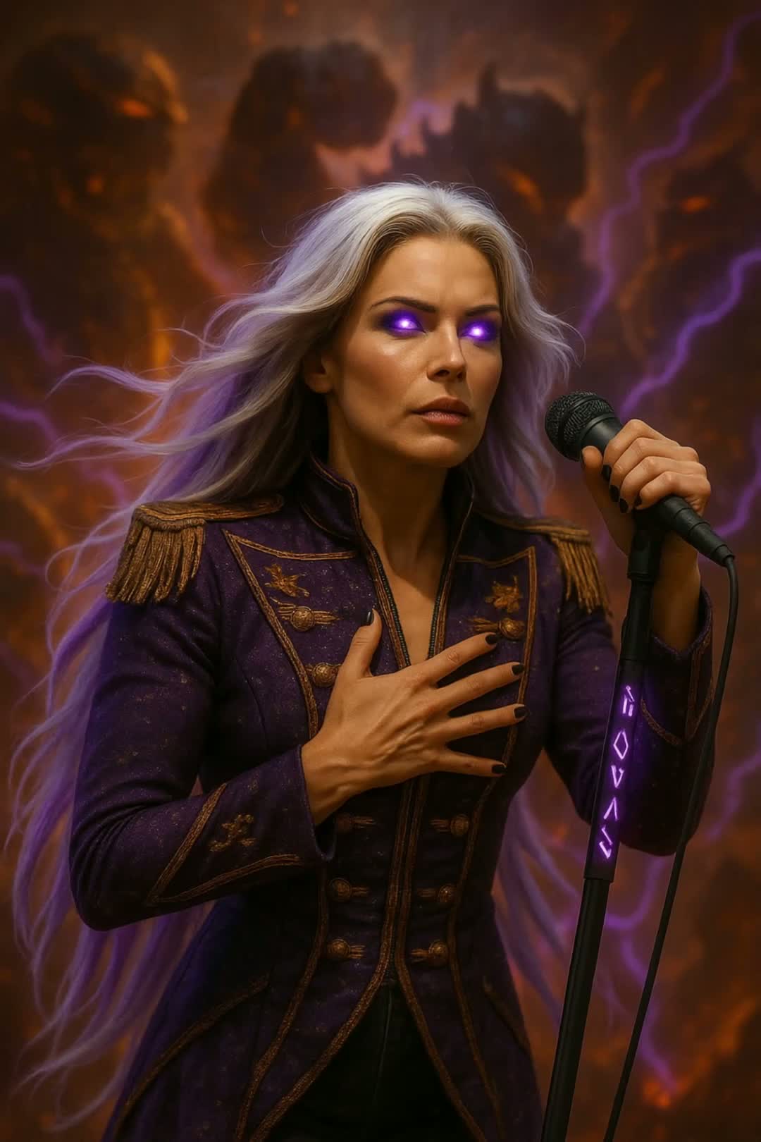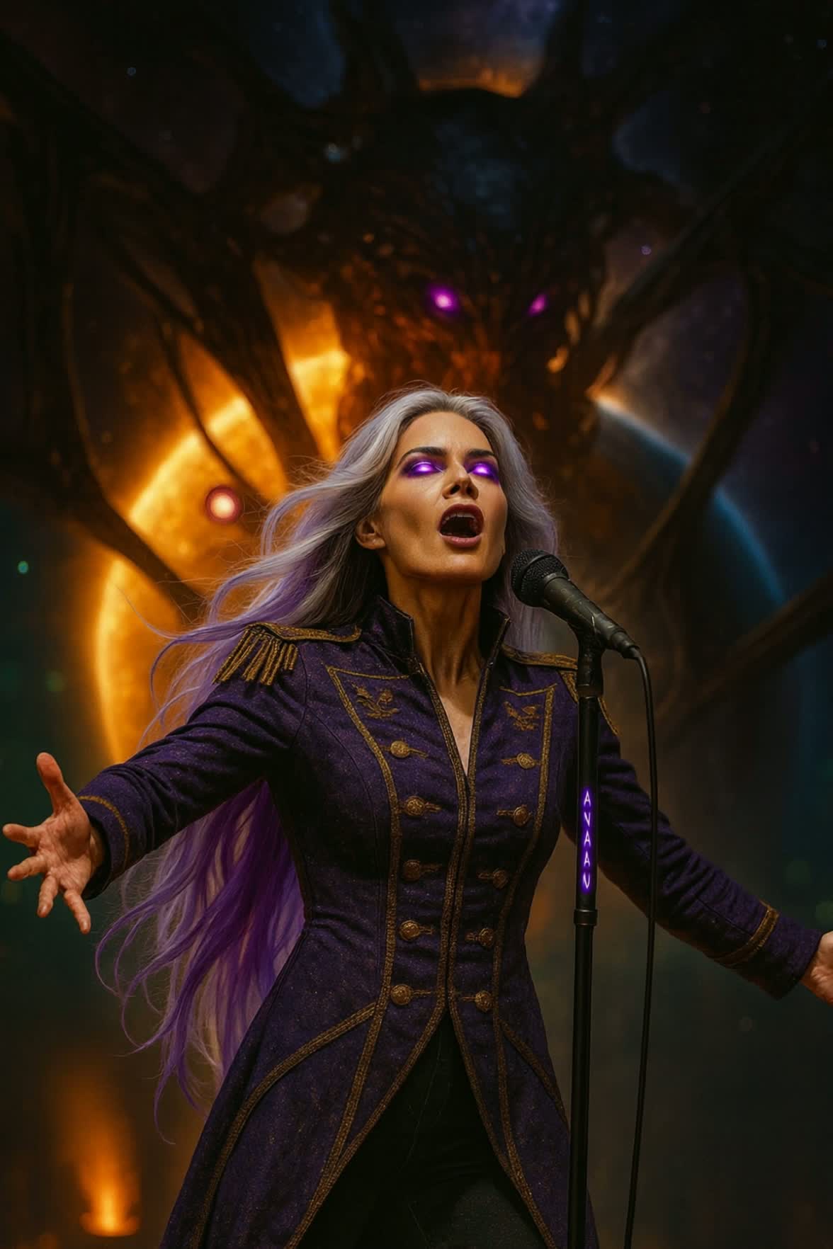 live concert, live epic symphonic metal, melodic metal, power metal, industrial-influenced metal, theatrical metal, darkwave metal, smooth riff-driven metal, layered female-fronted metal, stacked harmonised female vocals, belted soprano leads, smoky mezzo underlayers, whisper-sung interludes, melodic edges, choral background textures, syncopated kick/guitar lock-in, quad-tracked overdriven guitars, subharmonic DI/cab bass blend, tom-driven fills, ambient mic bleed, stereo crowd spill, stage-left vocal reverb tail, parallel-compressed drums, gate-processed snare, FOH mix coherence, audience response mapping, analog saturation, L2-limited headroom, mic-level realism, dynamic phrasing variance, tempo rubato breakdowns, ritardando transitions, theatrical but heavy, emotional weight, majestic, dangerous, soaring, supernova intensity